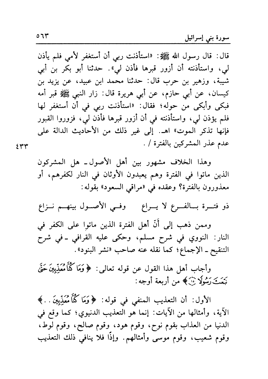 قال: قال رسول الله - صلى الله عليه وسلم -: "استأذنت ربي أن أستغفر لأمي فلم يأذن لي، واستأذنته أن أزور قبرها فأذن لي". حدثنا أبو بكر بن أبي شيبة، وزهير بن حرب قال: حدثنا محمد ابن عبيد، عن يزيد بن كيسان، عن أبي حازم، عن أبي هريرة قال: زار النبي - صلى الله عليه وسلم - قبر أمه فبكى وأبكى من حوله؛ فقال: "استأذنت ربي في أن أستغفر لها فلم يؤذن لي، واستأذنته في أن أزور قبرها فأذن لي، فزوروا القبور فإنها تذكر الموت" اهـ. إلى غير ذلك من الأحاديث الدالة على عدم عذر المشركين بالفترة.