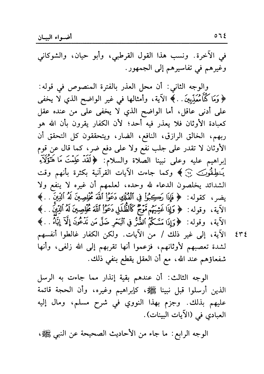 والوجه الثاني: أن محل العذر بالفترة المنصوص في قوله: {وَمَا كُنَّا مُعَذِّبِينَ .. } الآية، وأمثالها في غير الواضح الذي لا يخفى على أدنى عاقل، أما الواضح الذي لا يخفى على من عنده عقل كعبادة الأوثان فلا يعذر فيه أحد؛ لأن الكفار يقرون بأن الله هو ربهم، الخالق الرازق، النافع، الضار، ويتحققون كل التحقق أن الأوثان لا تقدر على جلب نفع ولا على دفع ضر، كما قال عن قوم إبراهيم عليه وعلى نبينا الصلاة والسلام: {لَقَدْ عَلِمْتَ مَا هَؤُلَاءِ يَنْطِقُونَ (٦٥)} وكما جاءت الآيات القرآنية بكثرة بأنهم وقت الشدائد يخلصون الدعاء لله وحده، لعلمهم أن غيره لا ينفع ولا يضر، كقوله: {فَإِذَا رَكِبُوا فِي الْفُلْكِ دَعَوُا اللَّهَ مُخْلِصِينَ لَهُ الدِّينَ .. } الآية، وقوله: {وَإِذَا غَشِيَهُمْ مَوْجٌ كَالظُّلَلِ دَعَوُا اللَّهَ مُخْلِصِينَ لَهُ الدِّينَ .. } الآية، وقوله: {وَإِذَا مَسَّكُمُ الضُّرُّ فِي الْبَحْرِ ضَلَّ مَنْ تَدْعُونَ إِلَّا إِيَّاهُ .. } الآية، إلى غير ذلك من الآيات. ولكن الكفار غالطوا أنفسهم لشدة تعصبهم لأوثانهم، فزعموا أنها تقربهم إلى الله زلفى، وأنها شفعاؤهم عند الله، مع أن العقل يقطع بنفي ذلك.