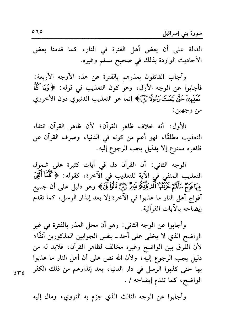 وأجاب القائلون بعذرهم بالفترة عن هذه الأوجه الأربعة: فأجابوا عن الوجه الأول، وهو كون التعذيب في قوله: {وَمَا كُنَّا مُعَذِّبِينَ حَتَّى نَبْعَثَ رَسُولًا (١٥)} إنما هو التعذيب الدنيوي دون الأخروي من وجهين: