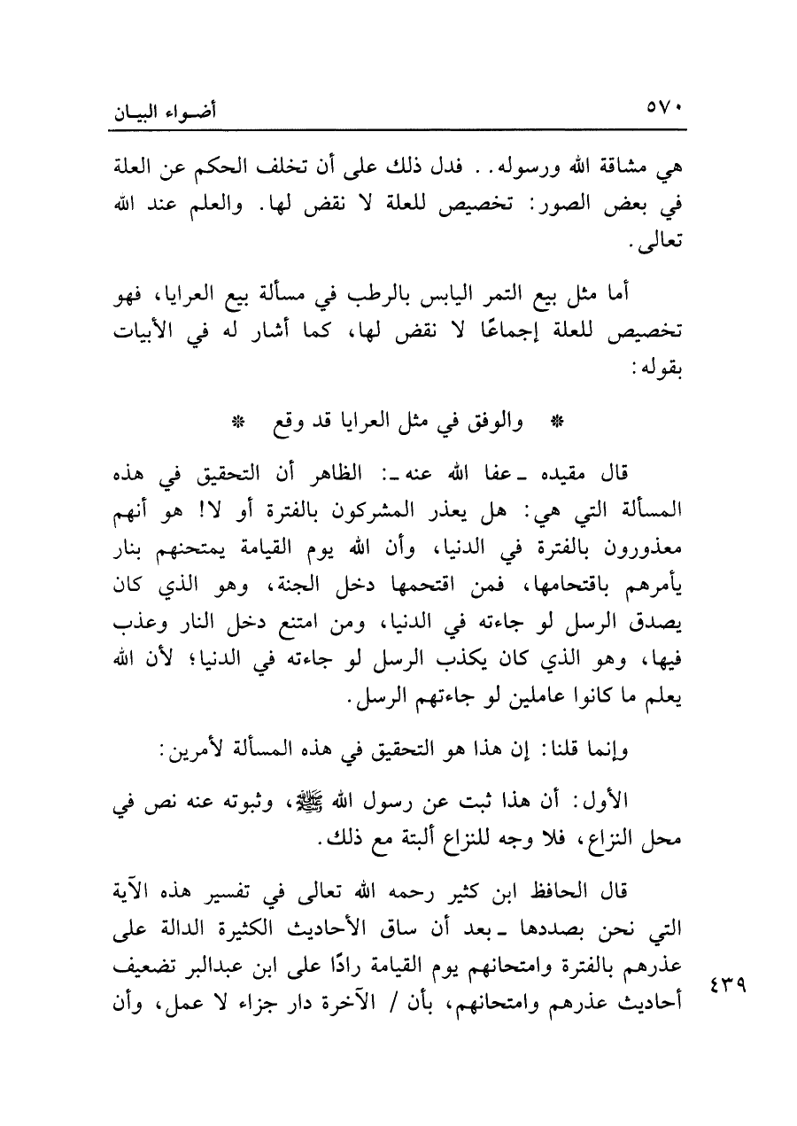 قال مقيده -عفا الله عنه-: الظاهر أن التحقيق في هذه المسألة التي هي: هل يعذر المشركون بالفترة أو لا! هو أنهم معذورون بالفترة في الدنيا، وأن الله يوم القيامة يمتحنهم بنار يأمرهم باقتحامها، فمن اقتحمها دخل الجنة، وهو الذي كان يصدق الرسل لو جاءته في الدنيا، ومن امتنع دخل النار وعذب فيها، وهو الذي كان يكذب الرسل لو جاءته في الدنيا؛ لأن الله يعلم ما كانوا عاملين لو جاءتهم الرسل.
