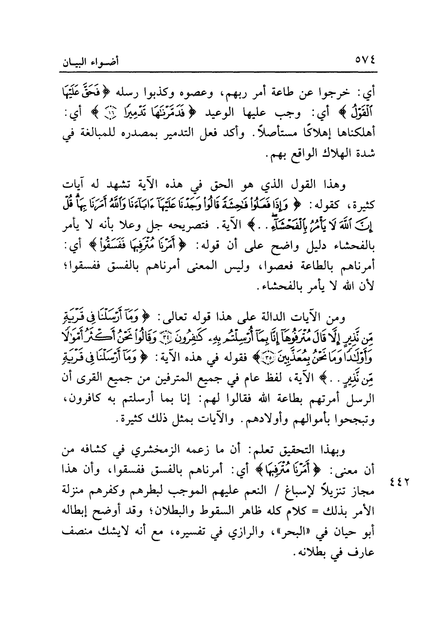 وبهذا التحقيق تعلم: أن ما زعمه الزمخشري في كشافه من أن معنى: {أَمَرْنَا مُتْرَفِيهَا} أي: أمرناهم بالفسق ففسقوا، وأن هذا مجاز تنزيلًا لإسباغ النعم عليهم الموجب لبطرهم وكفرهم منزلة الأمر بذلك = كلام كله ظاهر السقوط والبطلان؛ وقد أوضح إبطاله أبو حيان في "البحر"، والرازي في تفسيره، مع أنه لا يشك منصف عارف في بطلانه.