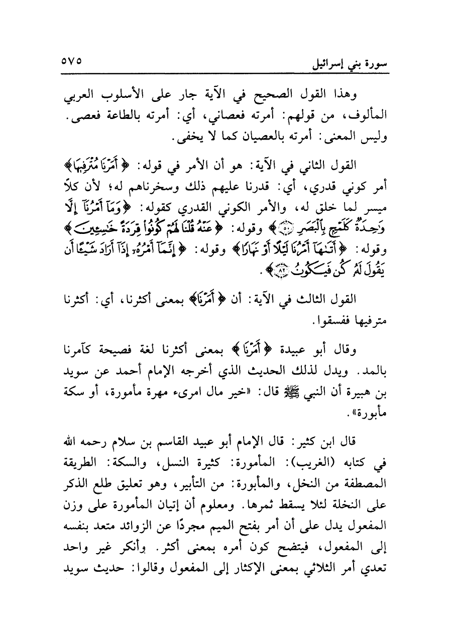 وقال أبو عبيدة {أَمْرُنَا} بمعنى أكثرنا لغة فصيحة كآمرنا بالمد. ويدل لذلك الحديث الذي أخرجه الإمام أحمد عن سويد بن هبيرة أن النبي - صلى الله عليه وسلم - قال: "خير مال امرئ مهرة مأمورة، أو سكة مأبورة".