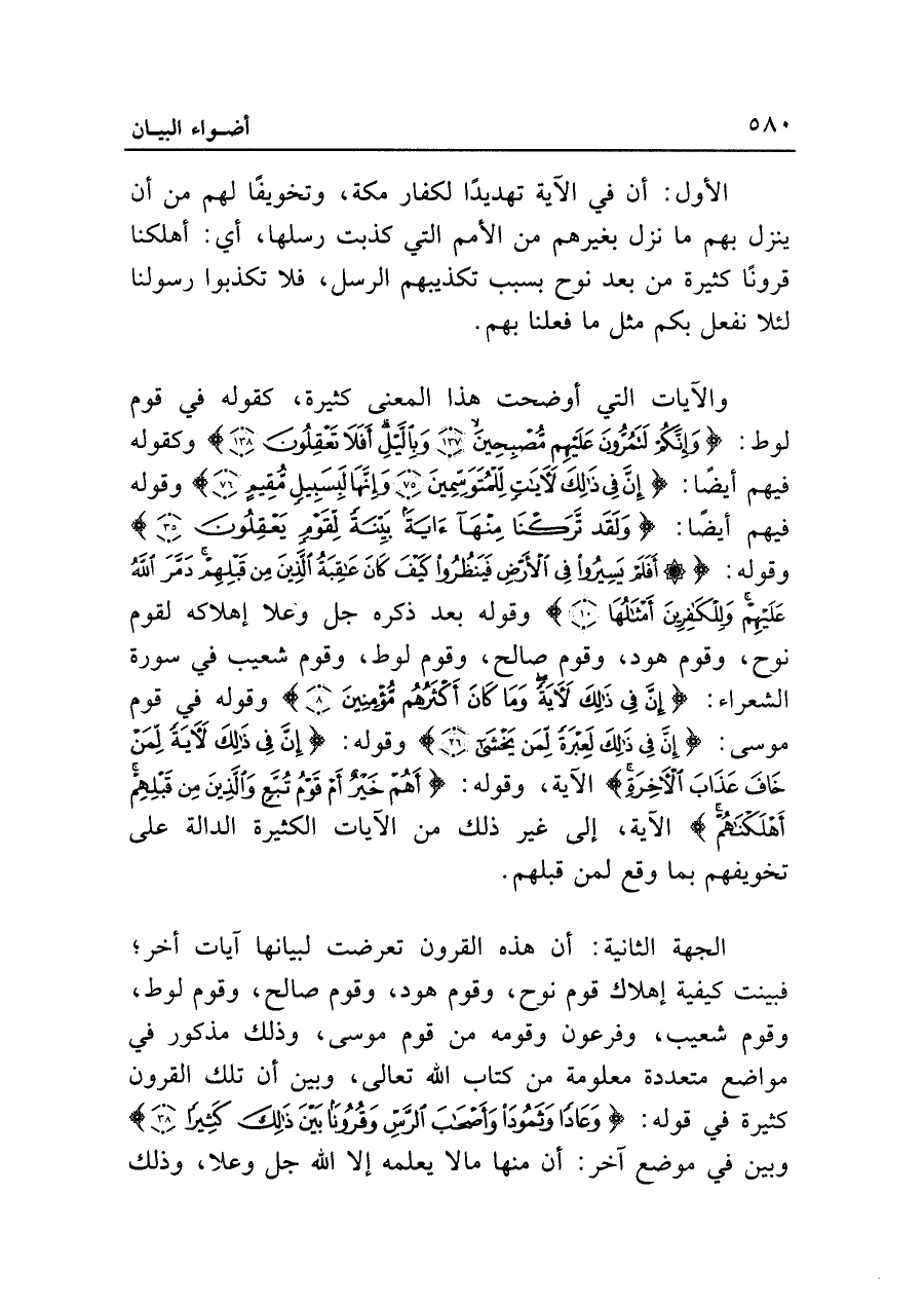 والآيات التي أوضحت هذا المعنى كثيرة، كقوله في قوم لوط: {وَإِنَّكُمْ لَتَمُرُّونَ عَلَيْهِمْ مُصْبِحِينَ (١٣٧) وَبِاللَّيْلِ أَفَلَا تَعْقِلُونَ (١٣٨)} وكقوله فيهم أيضًا: {إِنَّ فِي ذَلِكَ لَآيَاتٍ لِلْمُتَوَسِّمِينَ (٧٥) وَإِنَّهَا لَبِسَبِيلٍ مُقِيمٍ (٧٦)} وقوله فيهم أيضًا: {وَلَقَدْ تَرَكْنَا مِنْهَا آيَةً بَيِّنَةً لِقَوْمٍ يَعْقِلُونَ (٣٥)} وقوله: {أَفَلَمْ يَسِيرُوا فِي الْأَرْضِ فَيَنْظُرُوا كَيْفَ كَانَ عَاقِبَةُ الَّذِينَ مِنْ قَبْلِهِمْ دَمَّرَ اللَّهُ عَلَيْهِمْ وَلِلْكَافِرِينَ أَمْثَالُهَا (١٠)} وقوله بعد ذكره جل وعلا إهلاكه لقوم نوح، وقوم هود، وقوم صالح، وقوم لوط، وقوم شعيب في سورة الشعراء: {إِنَّ فِي ذَلِكَ لَآيَةً وَمَا كَانَ أَكْثَرُهُمْ مُؤْمِنِينَ (٨)} وقوله في قوم موسى: {إِنَّ فِي ذَلِكَ لَعِبْرَةً لِمَنْ يَخْشَى (٢٦)} وقوله: {إِنَّ فِي ذَلِكَ لَآيَةً لِمَنْ خَافَ عَذَابَ الْآخِرَةِ} الآية، وقوله: {أَهُمْ خَيْرٌ أَمْ قَوْمُ تُبَّعٍ وَالَّذِينَ مِنْ قَبْلِهِمْ أَهْلَكْنَاهُمْ} الآية، إلى غير ذلك من الآيات الكثيرة الدالة على تخويفهم بما وقع لمن قبلهم.
