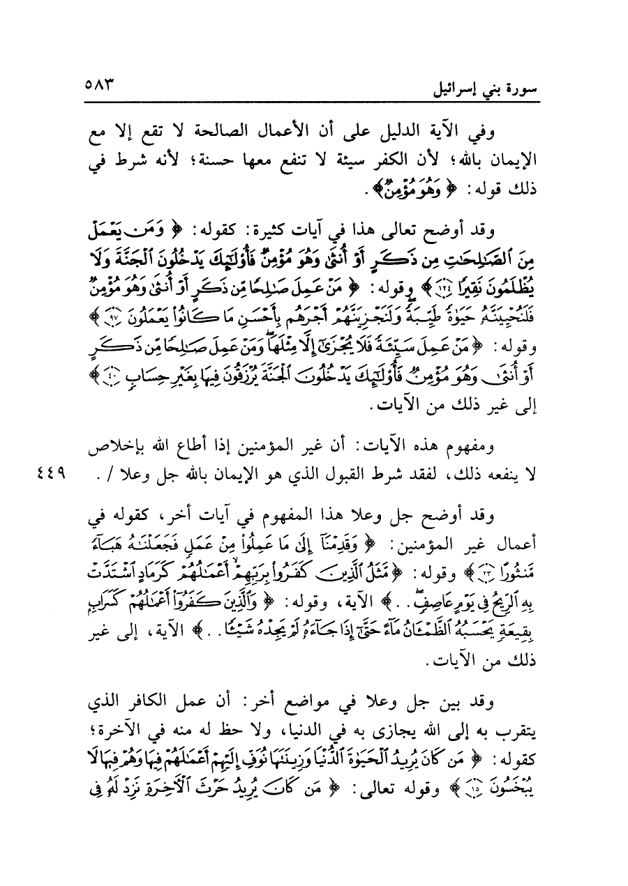 وقد أوضح جل وعلا هذا المفهوم في آيات أخر، كقوله في أعمال غير المؤمنين: {وَقَدِمْنَا إِلَى مَا عَمِلُوا مِنْ عَمَلٍ فَجَعَلْنَاهُ هَبَاءً مَنْثُورًا (٢٣)} وقوله: {مَثَلُ الَّذِينَ كَفَرُوا بِرَبِّهِمْ أَعْمَالُهُمْ كَرَمَادٍ اشْتَدَّتْ بِهِ الرِّيحُ فِي يَوْمٍ عَاصِفٍ .. } الآية، وقوله: {وَالَّذِينَ كَفَرُوا أَعْمَالُهُمْ كَسَرَابٍ بِقِيعَةٍ يَحْسَبُهُ الظَّمْآنُ مَاءً حَتَّى إِذَا جَاءَهُ لَمْ يَجِدْهُ شَيْئًا .. } الآية، إلى غير ذلك من الآيات.