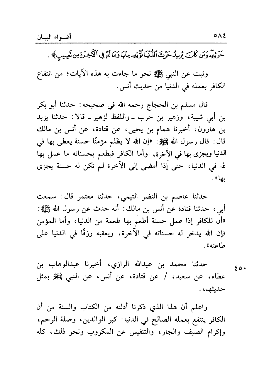 واعلم أن هذا الذي ذكرنا أدلته من الكتاب والسنة من أن الكافر ينتفع بعمله الصالح في الدنيا: كبر الوالدين، وصلة الرحم، وإكرام الضيف والجار، والتنفيس عن المكروب ونحو ذلك، كله