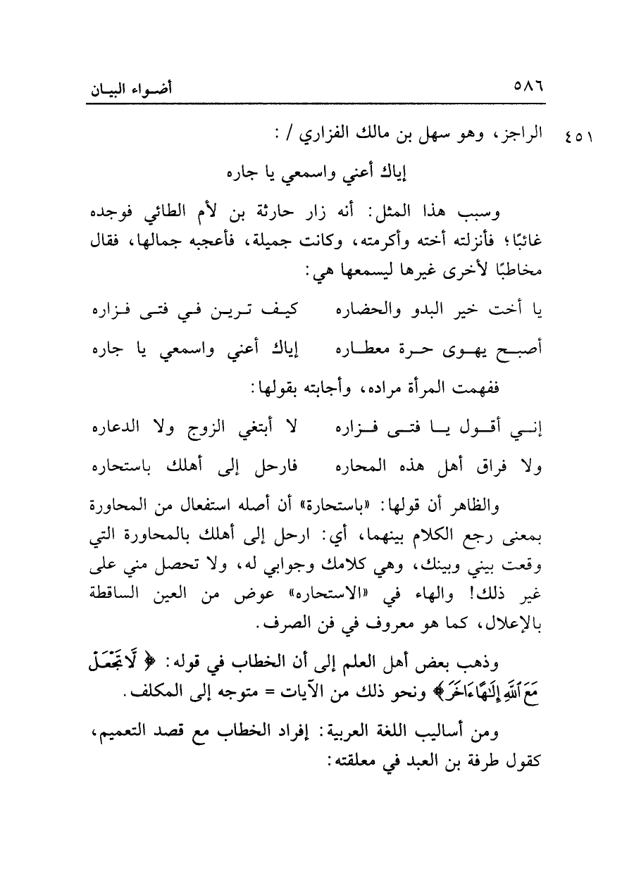 ومن أساليب اللغة العربية: إفراد الخطاب مع قصد التعميم، كقول طرفة بن العبد في معلقته: