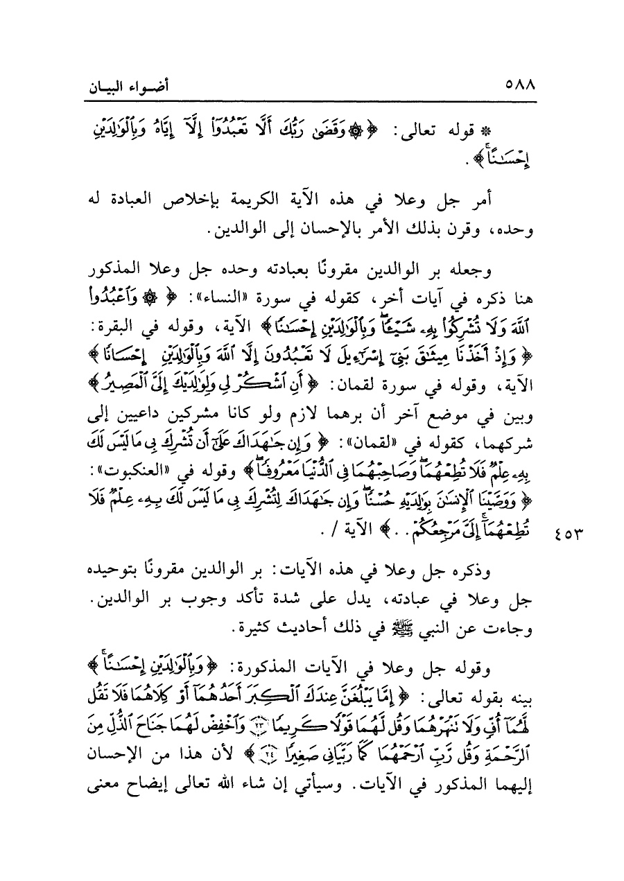 وجعله بن الوالدين مقرونًا بعبادته وحده جل وعلا المذكور هنا ذكره في آيات أخر، كقوله في سورة "النساء": {وَاعْبُدُوا اللَّهَ وَلَا تُشْرِكُوا بِهِ شَيْئًا وَبِالْوَالِدَيْنِ إِحْسَانًا} الآية، وقوله في البقرة: {وَإِذْ أَخَذْنَا مِيثَاقَ بَنِي إِسْرَائِيلَ لَا تَعْبُدُونَ إِلَّا اللَّهَ وَبِالْوَالِدَيْنِ إِحْسَانًا} الآية، وقوله في سورة لقمان: {أَنِ اشْكُرْ لِي وَلِوَالِدَيْكَ إِلَيَّ الْمَصِيرُ} وبين في موضع آخر أن برهما لازم ولو كانا مشركين داعيين إلى شركهما، كقوله في "لقمان": {وَإِنْ جَاهَدَاكَ عَلَى أَنْ تُشْرِكَ بِي مَا لَيْسَ لَكَ بِهِ عِلْمٌ فَلَا تُطِعْهُمَا وَصَاحِبْهُمَا فِي الدُّنْيَا مَعْرُوفًا} وقوله في "العنكبوت": {وَوَصَّيْنَا الْإِنْسَانَ بِوَالِدَيْهِ حُسْنًا وَإِنْ جَاهَدَاكَ لِتُشْرِكَ بِي مَا لَيْسَ لَكَ بِهِ عِلْمٌ فَلَا تُطِعْهُمَا إِلَيَّ مَرْجِعُكُمْ .. } الآية.