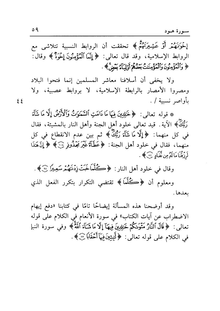 • قوله تعالى: {خَالِدِينَ فِيهَا مَا دَامَتِ السَّمَاوَاتُ وَالْأَرْضُ إِلَّا مَا شَاءَ رَبُّكَ} الآية. قيد تعالى خلود أهل الجنَّةَ وأهل النار بالمشيئة، فقال في كل منهما: {إِلَّا مَا شَاءَ رَبُّكَ} ثم بين عدم الانقطاع في كل منهما، فقال في خلود أهل الجنَّةَ: {عَطَاءً غَيْرَ مَجْذُوذٍ (١٠٨)} {إِنَّ هَذَا لَرِزْقُنَا مَا لَهُ مِنْ نَفَادٍ (٥٤)}.