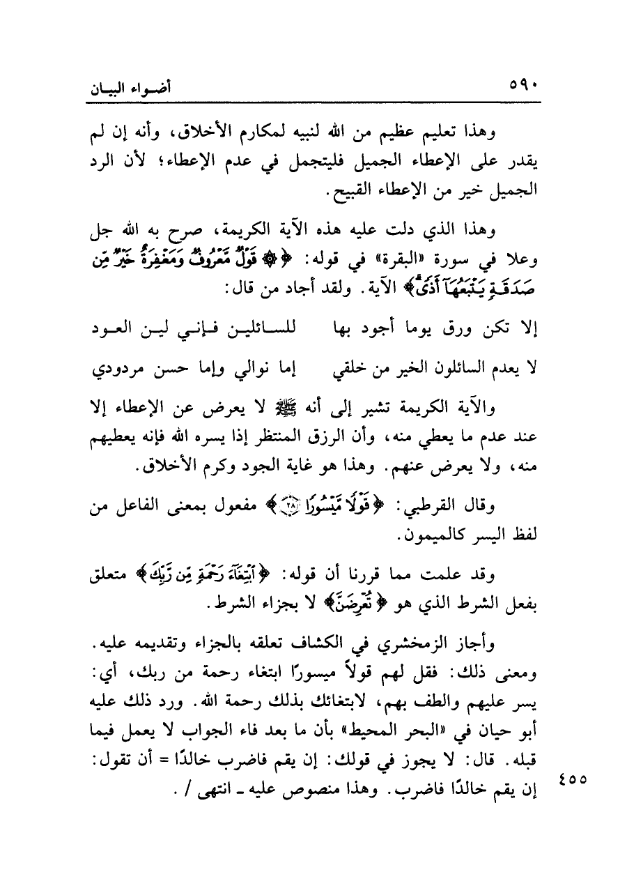 وأجاز الزمخشري في الكشاف تعلقه بالجزاء وتقديمه عليه. ومعنى ذلك: فقل لهم قولًا ميسورًا ابتغاء رحمة من ربك، أي: يسر عليهم والطف بهم، لابتغائك بذلك رحمة الله. ورد ذلك عليه أبو حيان في "البحر المحيط" بأن ما بعد فاء الجواب لا يعمل فيما قبله. قال: لا يجوز في قولك: إن يقم فاضرب خالدًا = أن تقول: إن يقم خالدًا فاضرب. وهذا منصوص عليه - انتهى.
