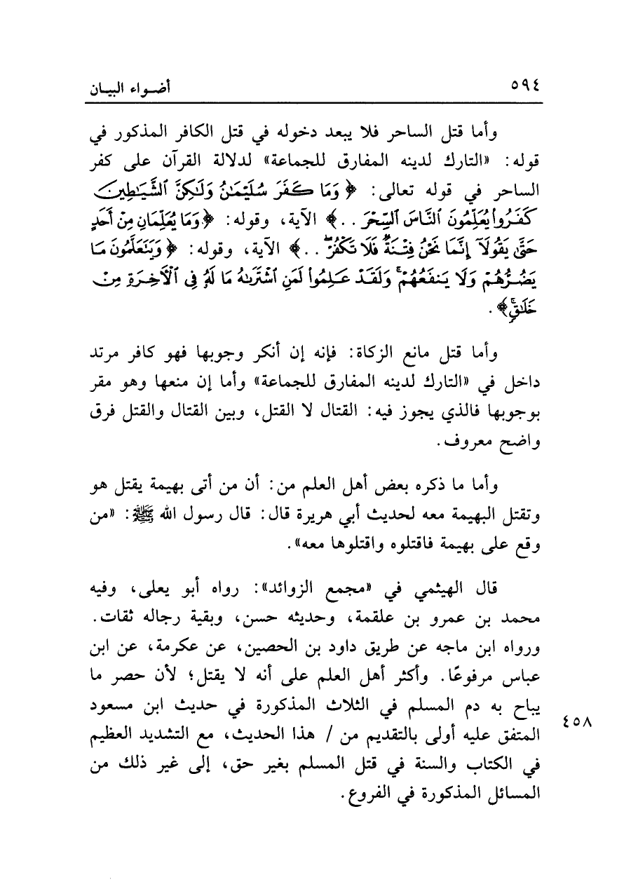 وأما قتل الساحر فلا يبعد دخوله في قتل الكافر المذكور في قوله: "التارك لدينه المفارق للجماعة" لدلالة القرآن على كفر الساحر في قوله تعالى: {وَمَا كَفَرَ سُلَيْمَانُ وَلَكِنَّ الشَّيَاطِينَ كَفَرُوا يُعَلِّمُونَ النَّاسَ السِّحْرَ .. } الآية، وقوله: {وَمَا يُعَلِّمَانِ مِنْ أَحَدٍ حَتَّى يَقُولَا إِنَّمَا نَحْنُ فِتْنَةٌ فَلَا تَكْفُر .. } الآية، وقوله: {وَيَتَعَلَّمُونَ مَا يَضُرُّهُمْ وَلَا يَنْفَعُهُمْ وَلَقَدْ عَلِمُوا لَمَنِ اشْتَرَاهُ مَا لَهُ فِي الْآخِرَةِ مِنْ خَلَاقٍ}.