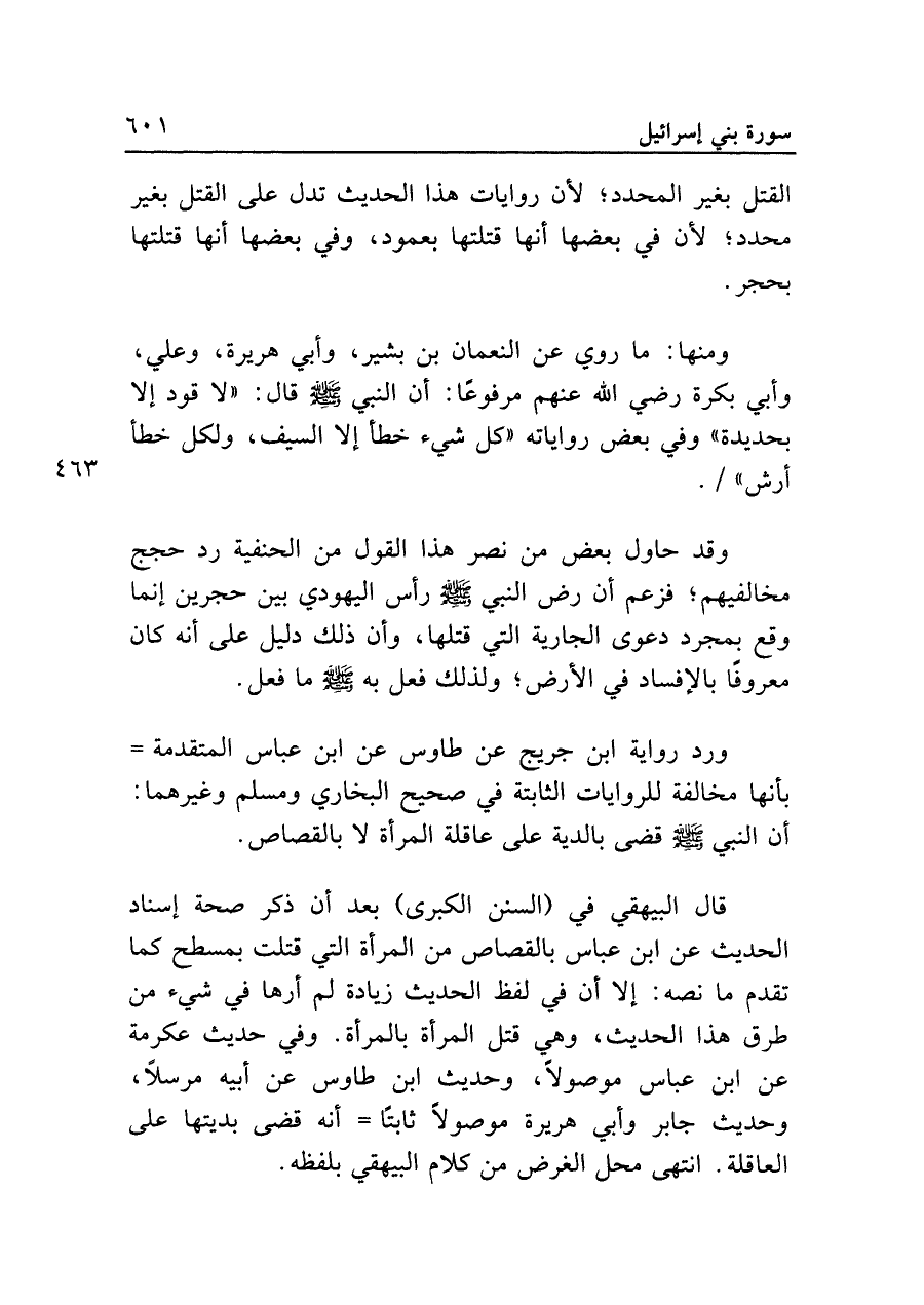 قال البيهقي في (السنن الكبرى) بعد أن ذكر صحة إسناد الحديث عن ابن عباس بالقصاص من المرأة التي قتلت بمسطح كما تقدم ما نصه: إلا أن في لفظ الحديث زيادة لم أرها في شيء من طرق هذا الحديث، وهي قتل المرأة بالمرأة. وفي حديث عكرمة عن ابن عباس موصولًا، وحديث ابن طاوس عن أبيه مرسلًا، وحديث جابر وأبي هريرة موصولًا ثابتًا = أنه قضى بديتها على العاقلة. انتهى محل الغرض من كلام البيهقي بلفظه.