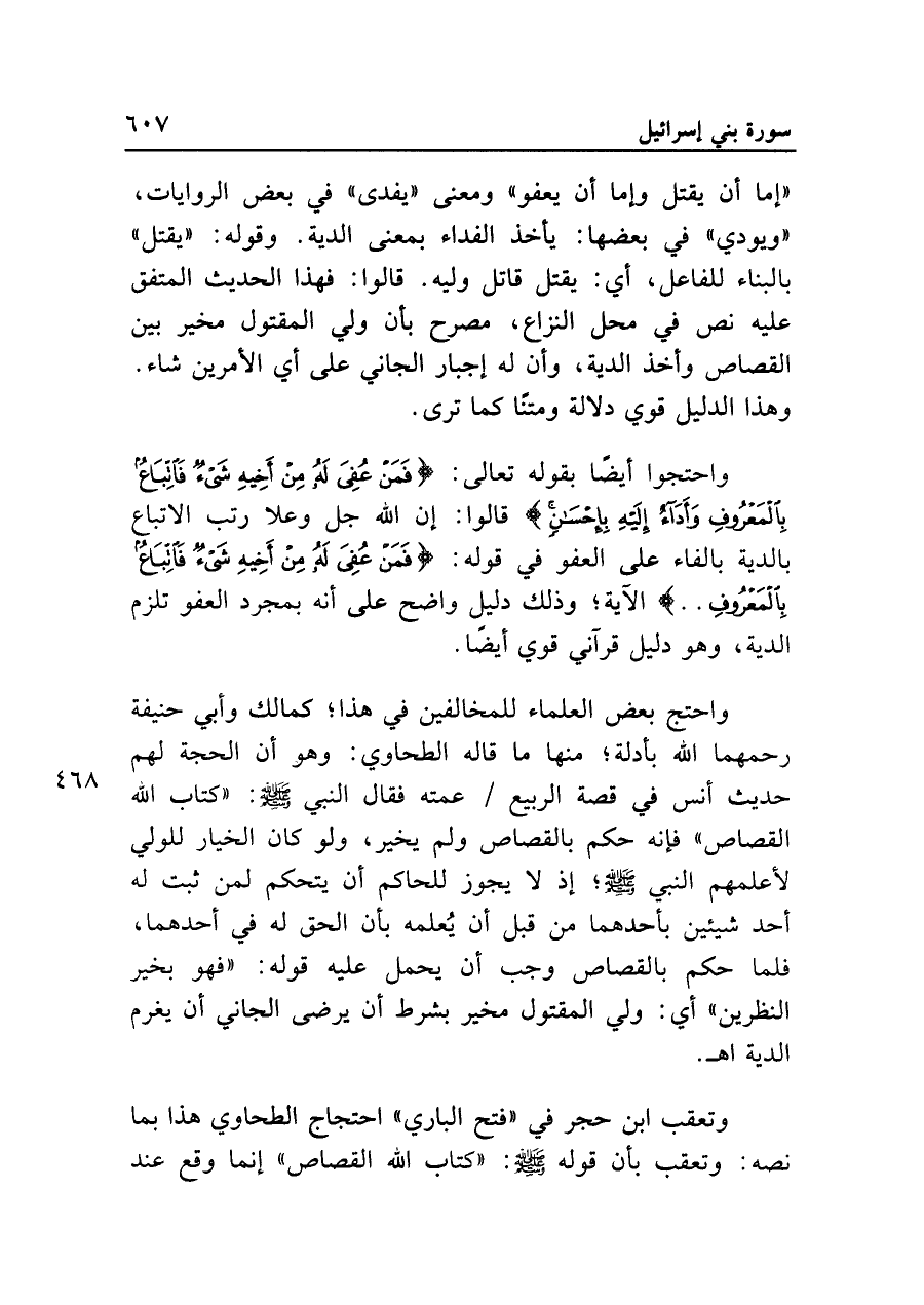"إما أن يقتل وإما أن يعفو" ومعنى "يفدى" في بعض الروايات، "ويودي" في بعضها: يأخذ الفداء بمعنى الدية. وقوله: "يقتل" بالبناء للفاعل، أي: يقتل قاتل وليه. قالوا: فهذا الحديث المتفق عليه نص في محل النزاع، مصرح بأن ولي المقتول مخير بين القصاص وأخذ الدية، وأن له إجبار الجاني على أي الأمرين شاء. وهذا الدليل قوي دلالة ومتنًا كما ترى.