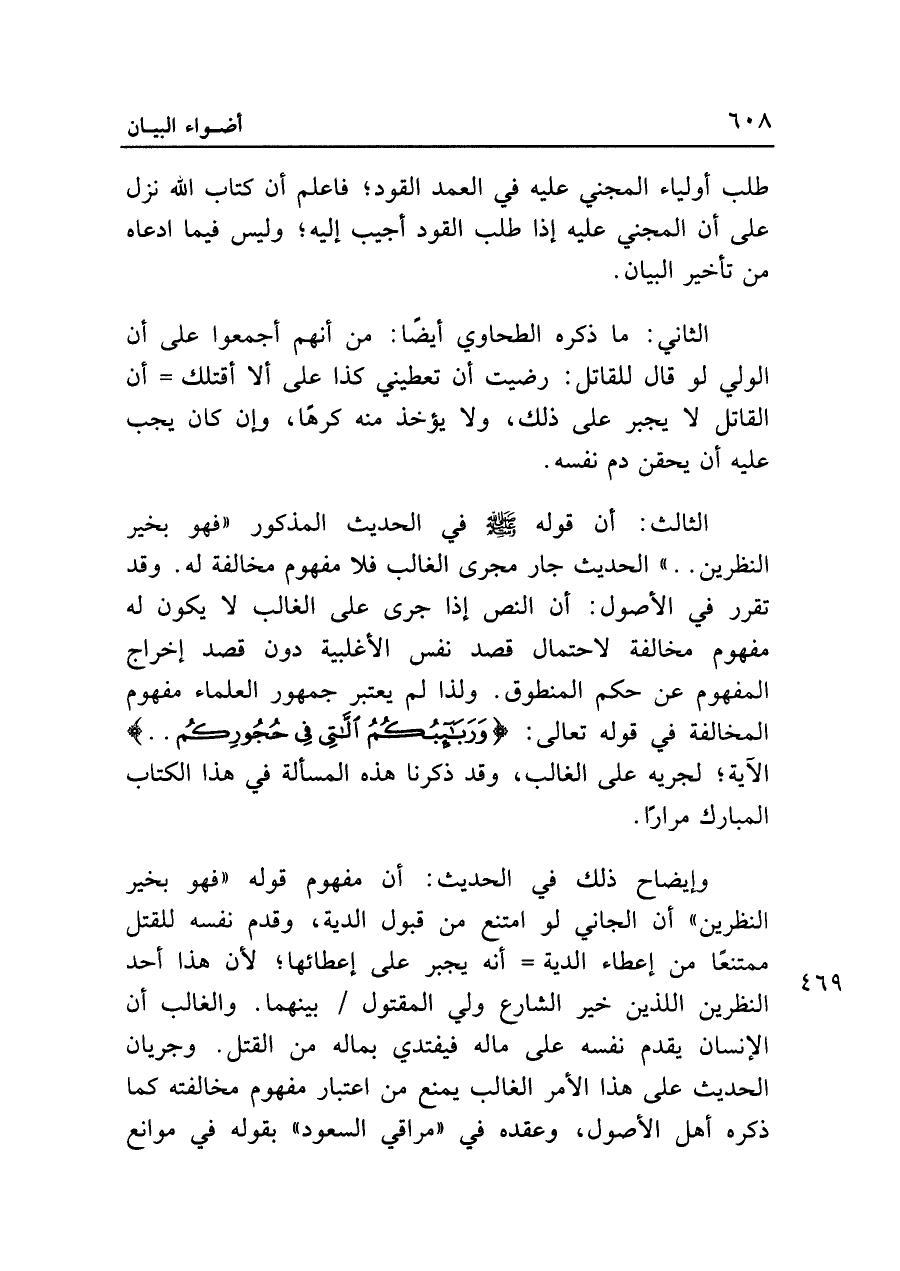 وإيضاح ذلك في الحديث: أن مفهوم قوله "فهو بخير النظرين" أن الجاني لو امتنع من قبول الدية، وقدم نفسه للقتل ممتنعًا من إعطاء الدية = أنه يجبر على إعطائها؛ لأن هذا أحد النظرين اللذين خير الشارع ولي المقتول بينهما. والغالب أن الإنسان يقدم نفسه على ماله فيفتدي بماله من القتل. وجريان الحديث على هذا الأمر الغالب يمنع من اعتبار مفهوم مخالفته كما ذكره أهل الأصول، وعقده في "مراقي السعود" بقوله في موانع