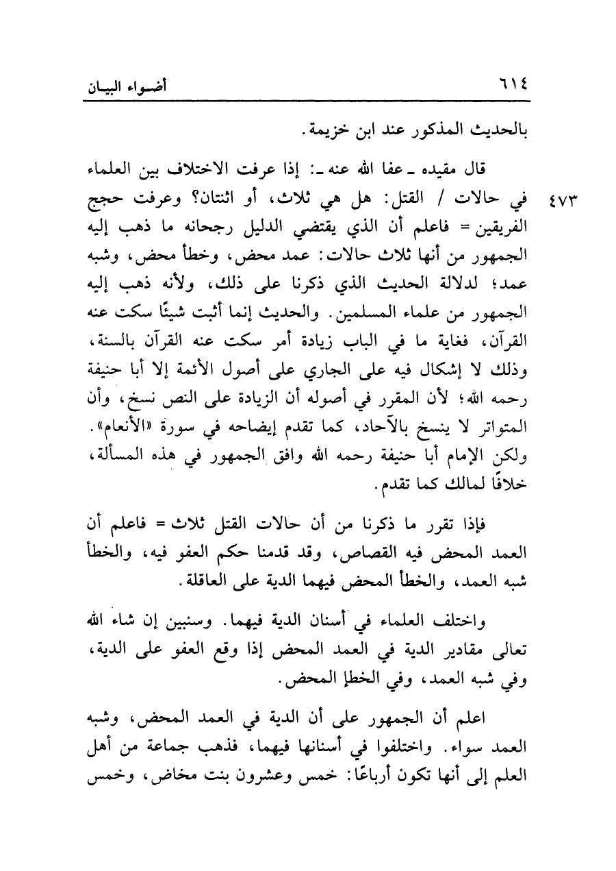 قال مقيده -عفا الله عنه-: إذا عرفت الاختلاف بين العلماء في حالات القتل: هل هي ثلاث، أو اثنتان؟ وعرفت حجج الفريقين = فاعلم أن الذي يقتضي الدليل رجحانه ما ذهب إليه الجمهور من أنها ثلاث حالات: عمد محض، وخطأ محض، وشبه عمد؛ لدلالة الحديث الذي ذكرنا على ذلك، ولأنه ذهب إليه الجمهور من علماء المسلمين. والحديث إنما أثبت شيئًا سكت عنه القرآن، فغاية ما في الباب زيادة أمر سكت عنه القرآن بالنسبة، وذلك لا إشكال فيه على الجاري على أصول الأئمة إلا أبا حنيفة رحمه الله؛ لأن المقرر في أصوله أن الزيادة على النص نسخ، وأن المتواتر لا ينسخ بالآحاد، كما تقدم إيضاحه في سورة "الأنعام". ولكن الإمام أبا حنيفة رحمه الله وافق الجمهور في هذه المسألة، خلافًا لمالك كما تقدم.