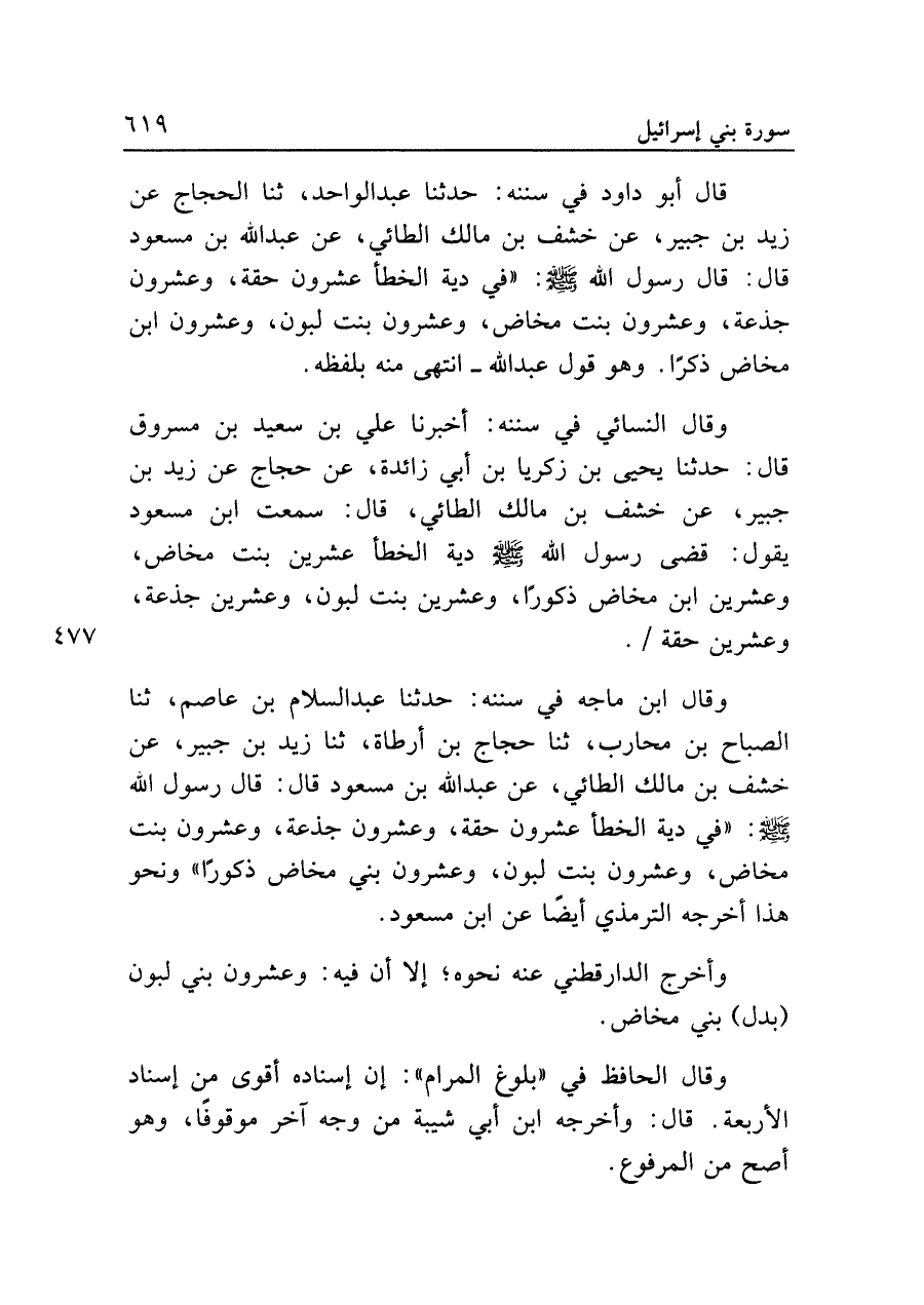 قال أبو داود في سننه: حدثنا عبد الواحد، ثنا الحجاج عن زيد بن جبير، عن خشف بن مالك الطائي، عن عبد الله بن مسعود قال: قال رسول الله - صلى الله عليه وسلم -: "في دية الخطأ عشرون حقة، وعشرون جذعة، وعشرون بنت مخاض، وعشرون بنت لبون، وعشرون ابن مخاض ذكرًا. وهو قول عبد الله - انتهى منه بلفظه.