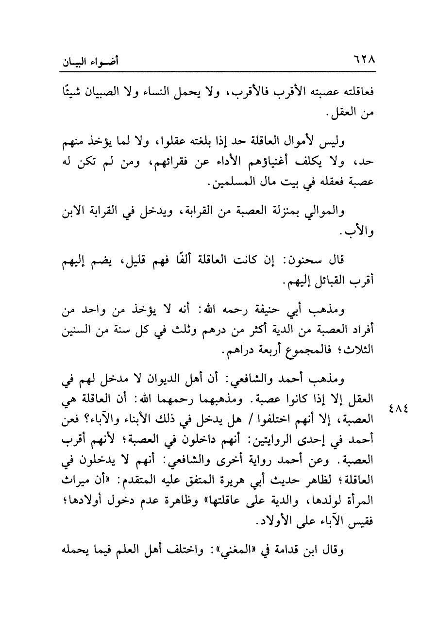ومذهب أحمد والشافعي: أن أهل الديوان لا مدخل لهم في العقل إلا إذا كانوا عصبة. ومذهبهما رحمهما الله: أن العاقلة هي العصبة، إلا أنهم اختلفوا هل يدخل في ذلك الأبناء والآباء؟ فعن أحمد في إحدى الروايتين: أنهم داخلون في العصبة؛ لأنهم أقرب العصبة. وعن أحمد رواية أخرى والشافعي: أنهم لا يدخلون في العاقلة؛ لظاهر حديث أبي هريرة المتفق عليه المتقدم: "أن ميراث المرأة لولدها، والدية على عاقلتها" وظاهرة عدم دخول أولادها؛ فقيس الآباء على الأولاد.