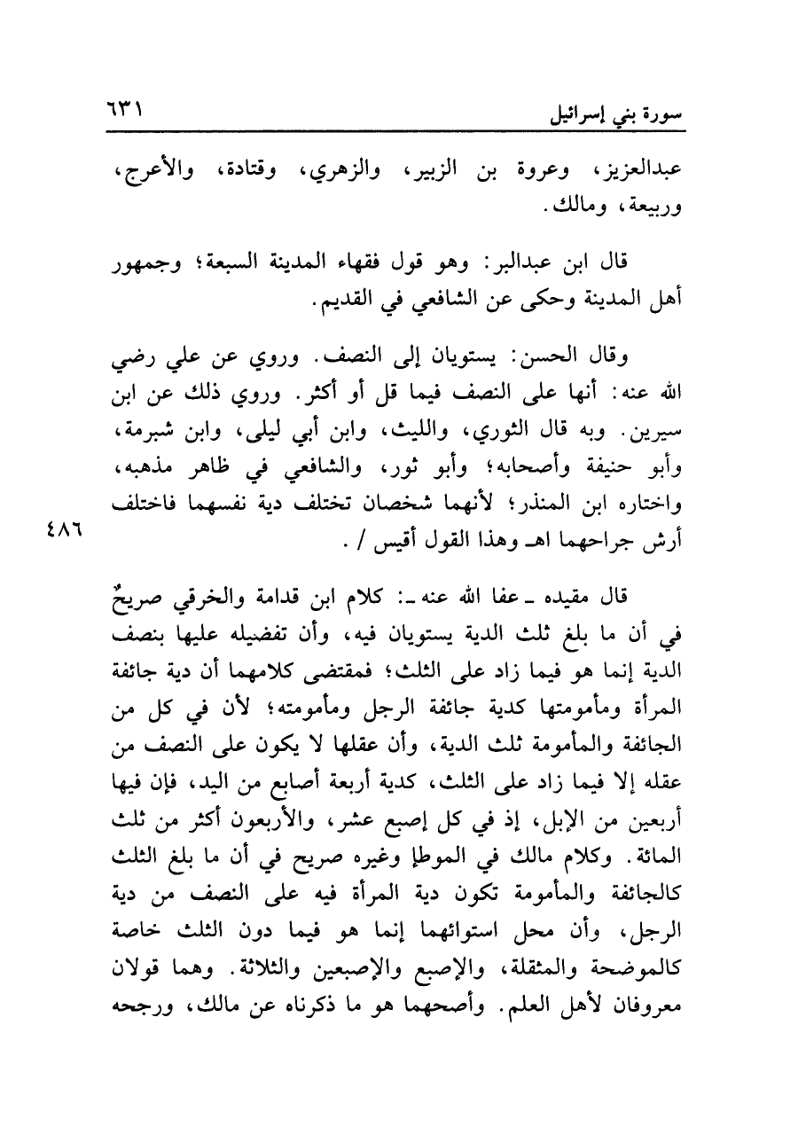 قال مقيده -عفا الله عنه-: كلام ابن قدامة والخرقي صريحٌ في أن ما بلغ ثلث الدية يستويان فيه، وأن تفضيله عليها بنصف الدية إنما هو فيما زاد على الثلث؛ فمقتضى كلامهما أن دية جائفة المرأة ومأمومتها كدية جائفة الرجل ومأمومته؛ لأن في كل من الجائفة والمأمومة ثلث الدية، وأن عقلها لا يكون على النصف من عقله إلا فيما زاد على الثلث، كدية أربعة أصابع من اليد، فإن فيها أربعين من الإبل، إذ في كل إصبع عشر، والأربعون أكثر من ثلث المائة. وكلام مالك في الموطإ وغيره صريح في أن ما بلغ الثلث كالجائفة والمأمومة تكون دية المرأة فيه على النصف من دية الرجل، وأن محل استوائهما إنما هو فيما دون الثلث خاصة كالموضحة والمثقلة، والإصبع والإصبعين والثلاثة. وهما قولان معروفان لأهل العلم. وأصحهما هو ما ذكرناه عن مالك، ورجحه