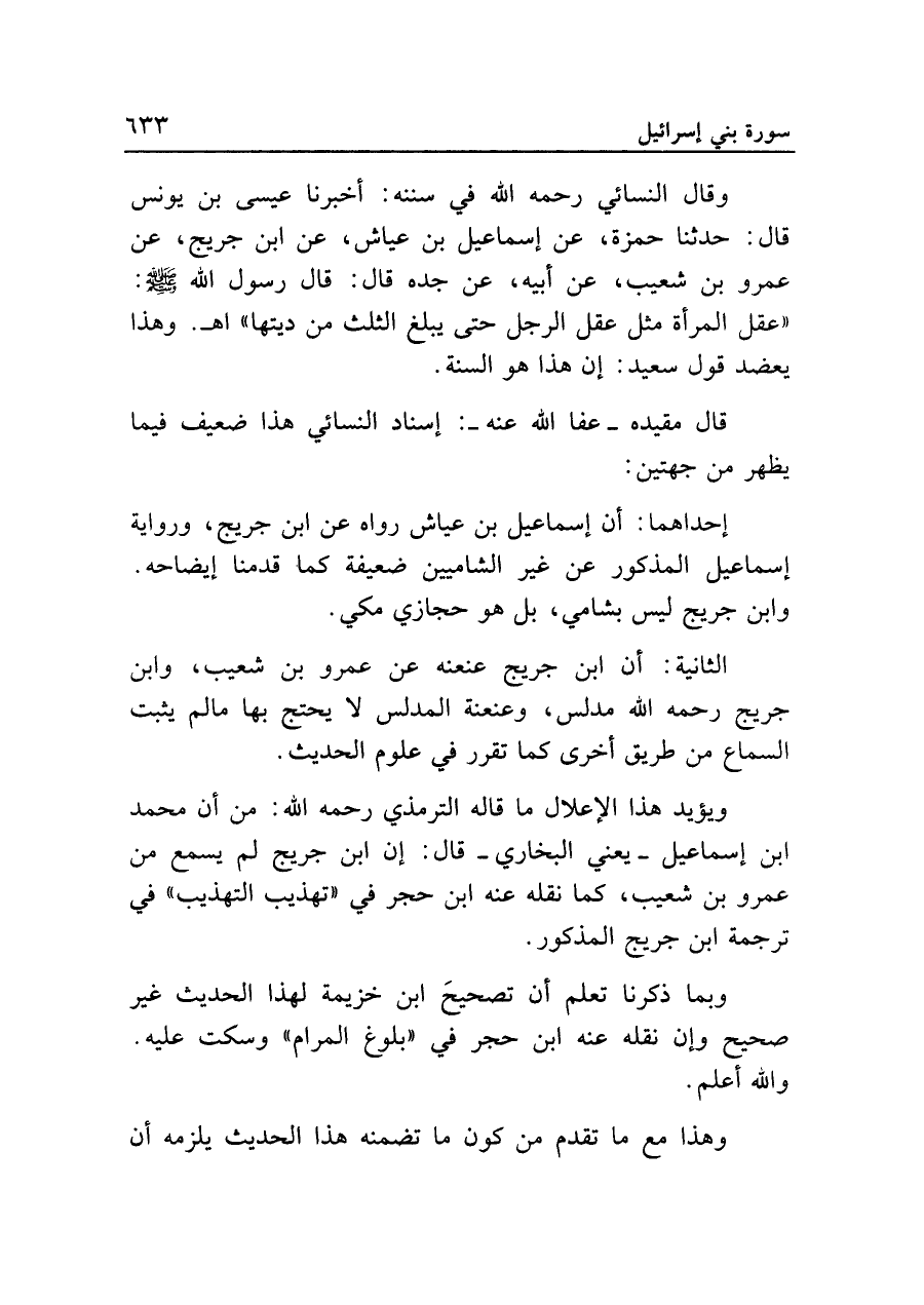 وقال النسائي رحمه الله في سننه: أخبرنا عيسى بن يونس قال: حدثنا حمزة، عن إسماعيل بن عياش، عن ابن جريج، عن عمرو بن شعيب، عن أبيه، عن جده قال: قال رسول الله - صلى الله عليه وسلم -: "عقل المرأة مثل عقل الرجل حتى يبلغ الثلث من ديتها" اهـ. وهذا يعضد قول سعيد: إن هذا هو السنة.