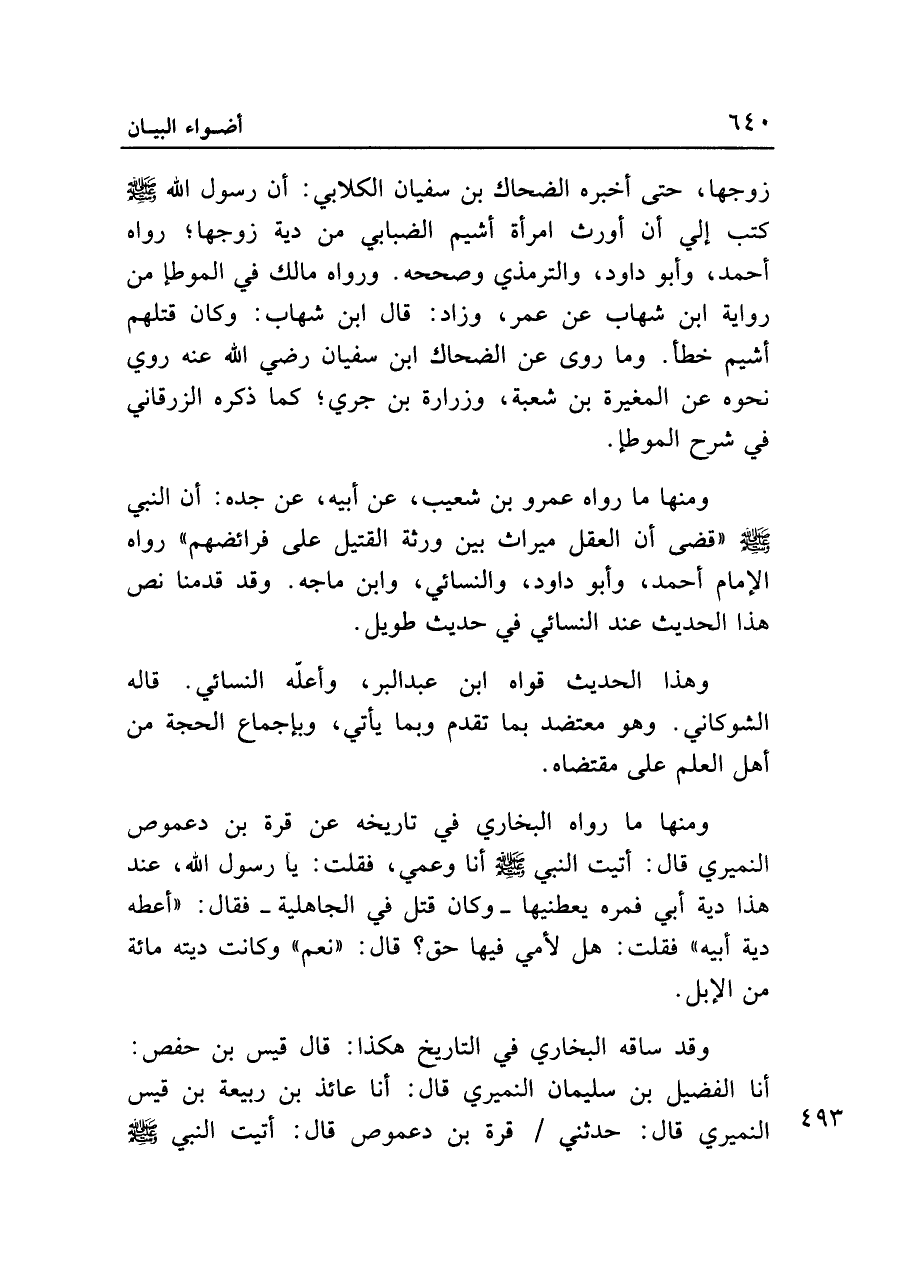 زوجها، حتى أخبره الضحاك بن سفيان الكلابي: أن رسول الله - صلى الله عليه وسلم - كتب إلى أن أورث امرأة أشيم الضبابي من دية زوجها؛ رواه أحمد، وأبو داود، والترمذي وصححه. ورواه مالك في الموطإ من رواية ابن شهاب عن عمر، وزاد: قال ابن شهاب: وكان قتلهم أشيم خطأ. وما روى عن الضحاك ابن سفيان رضي الله عنه روي نحوه عن المغيرة بن شعبة، وزرارة بن جري؛ كما ذكره الزرقاني في شرح الموطإ.