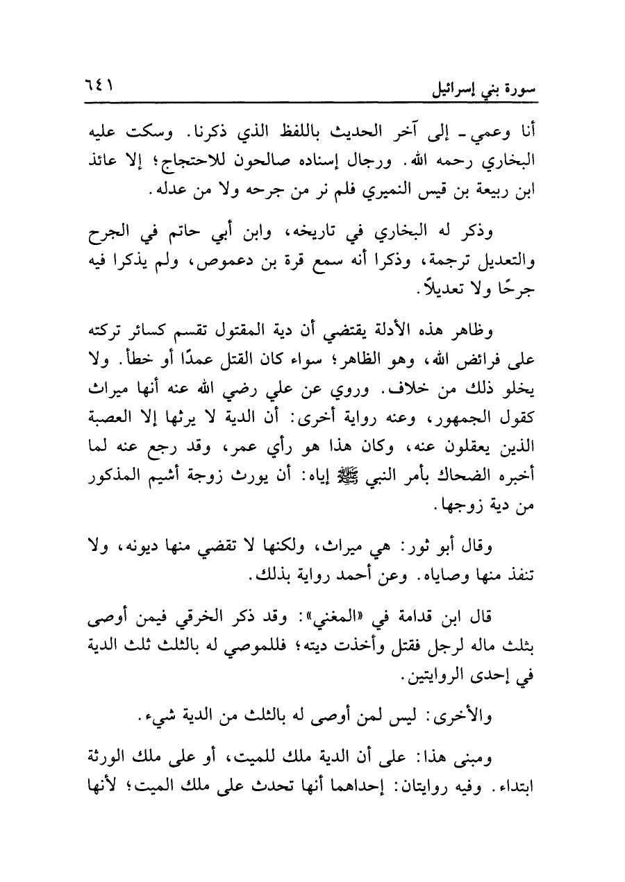 وظاهر هذه الأدلة يقتضي أن دية المقتول تقسم كسائر تركته على فرائض الله، وهو الظاهر؛ سواء كان القتل عمدًا أو خطأ. ولا يخلو ذلك من خلاف. وروي عن على رضي الله عنه أنها ميراث كقول الجمهور، وعنه رواية أخرى: أن الدية لا يرثها إلا العصبة الذين يعقلون عنه، وكان هذا هو رأي عمر، وقد رجع عنه لما أخبره الضحاك بأمر النبي - صلى الله عليه وسلم - إياه: أن يورث زوجة أشيم المذكور من دية زوجها.