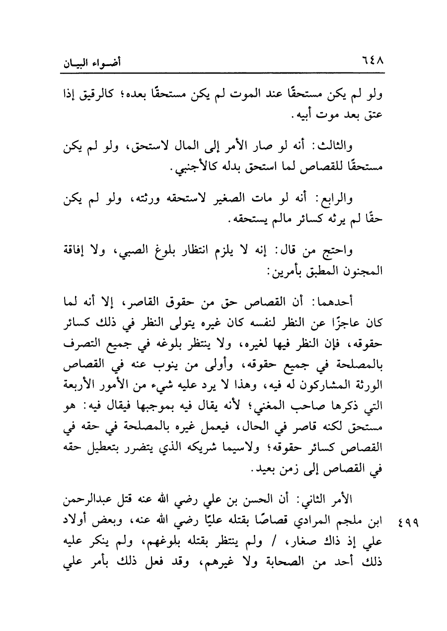 الأمر الثاني: أن الحسن بن علي رضي الله عنه قتل عبد الرحمن ابن ملجم المرادي قصاصًا بقتله عليًا رضي الله عنه، وبعض أولاد على إذ ذاك صغار، ولم ينتظر بقتله بلوغهم، ولم ينكر عليه ذلك أحد من الصحابة ولا غيرهم، وقد فعل ذلك بأمر علي