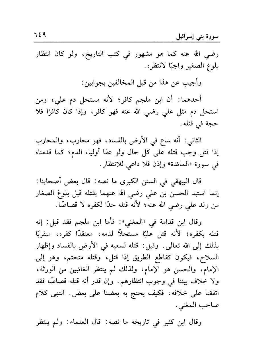 وقال ابن قدامة في "المغني": فأما ابن ملجم فقد قيل: إنه قتله بكفره؛ لأنه قتل عليًا مستحلًا لدمه، معتقدًا كفره، متقربًا بذلك إلى الله تعالى. وقيل: قتله لسعيه في الأرض بالفساد وإظهار السلاح، فيكون كقاطع الطريق إذا قتل، وقتله متحتم، وهو إلى الإمام، والحسن هو الإمام، ولذلك لم ينتظر الغائبين من الورثة، ولا خلاف بيننا في وجوب انتظارهم. وإن قدر أنه قتله قصاصًا فقد اتفقنا على خلافه، فكيف يحتج به بعضنا على بعض. انتهى كلام صاحب المغني.