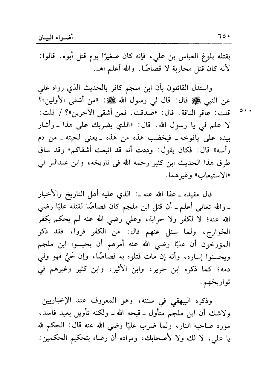 وذكره البيهقي في سننه، وهو المعروف عند الإخباريين. ولا شك أن ابن ملجم متأول -قبحه الله- ولكنه تأويل بعيد فاسد، مورد صاحبه النار، ولما ضرب عليا رضي الله عنه قال: الحكم لله يا علي، لا لك ولا لأصحابك، ومراده أن رضاه بتحكيم الحكمين: