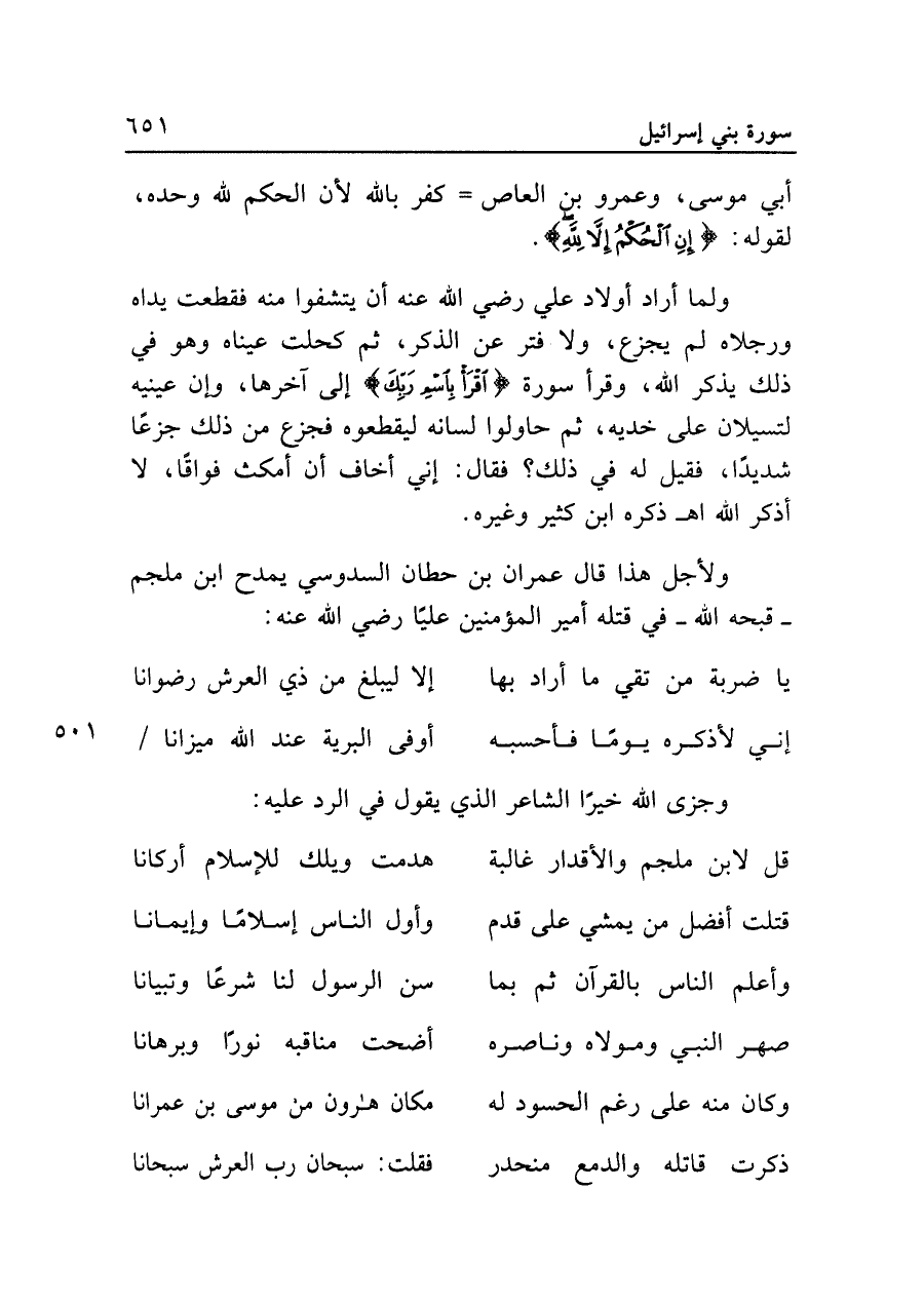ولأجل هذا قال عمران بن حطان السدوسي يمدح ابن ملجم -قبحه الله- في قتله أمير المؤمنين عليا رضي الله عنه: