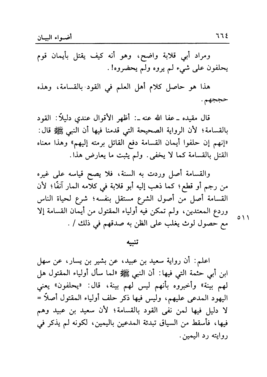 اعلم: أن رواية سعيد بن عبيد، عن بشير بن يسار، عن سهل ابن أبي حثمة التي فيها: أن النبي - صلى الله عليه وسلم - "لما سأل أولياء المقتول هل لهم بينة" وأخبروه بأنهم ليس لهم بينة، قال: "يحلفون" يعني اليهود المدعى عليهم، وليس فيها ذكر حلف أولياء المقتول أصلًا = لا دليل فيها لمن نفى القود بالقسامة؛ لأن سعيد بن عبيد وهم فيها، فأسقط من السياق تبدئة المدعين باليمين، لكونه لم يذكر في روايته رد اليمين.