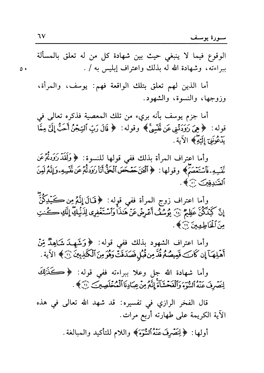 أما جزم يوسف بأنه بريء من تلك المعصية فذكره تعالى في قوله: {هِىَ راوَدَتْنِى عَنْ نَفْسِى} وقوله: {قَالَ رَبِّ السِّجْنُ أَحَبُّ إِلَيَّ مِمَّا يَدْعُونَنِي إِلَيْهِ} الآية.