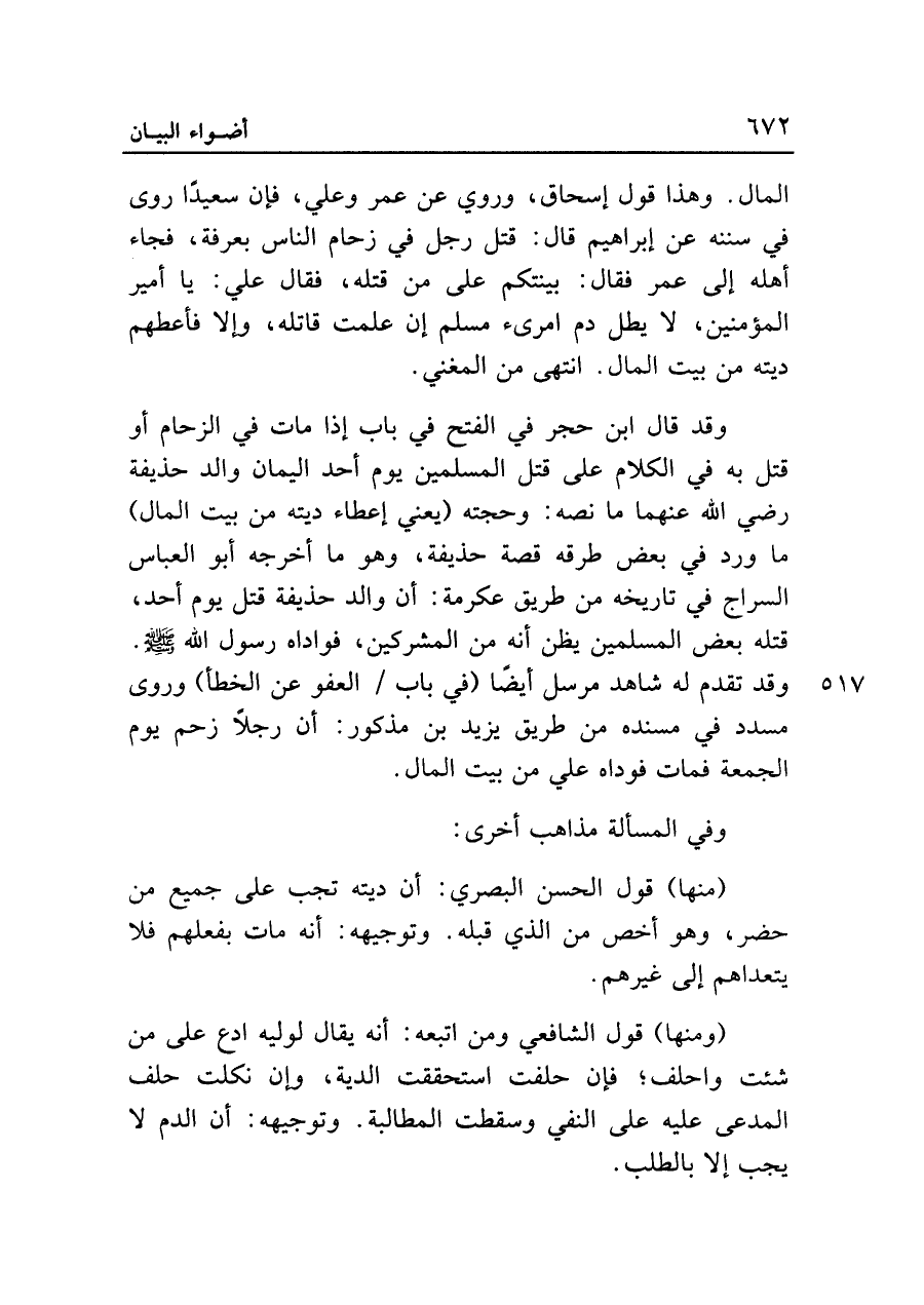 وقد قال ابن حجر في الفتح في باب إذا مات في الزحام أو قتل به في الكلام على قتل المسلمين يوم أحد اليمان والد حذيفة رضي الله عنهما ما نصه: وحجته (يعني إعطاء ديته من بيت المال) ما ورد في بعض طرقه قصة حذيفة، وهو ما أخرجه أبو العباس السراج في تاريخه من طريق عكرمة: أن والد حذيفة قتل يوم أحد، قتله بعض المسلمين يظن أنه من المشركين، فواداه رسول الله - صلى الله عليه وسلم -. وقد تقدم له شاهد مرسل أيضًا (في باب العفو عن الخطأ) وروى مسدد في مسنده من طريق يزيد بن مذكور: أن رجلًا زحم يوم الجمعة فمات فوداه علي من بيت المال.