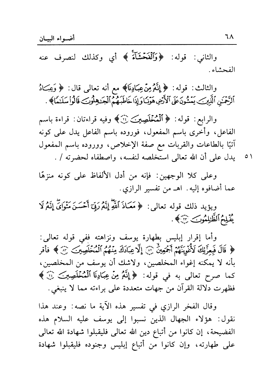 وقال الفخر الرازي في تفسير هذه الآية ما نصه: وعند هذا نقول: هؤلاء الجهال الذين نسبوا إلى يوسف عليه السلام هذه الفضيحة، إن كانوا من أتباع دين الله تعالى فليقبلوا شهادة الله تعالى على طهارته، وإن كانوا من أتباع إبليس وجنوده فليقبلوا شهادة