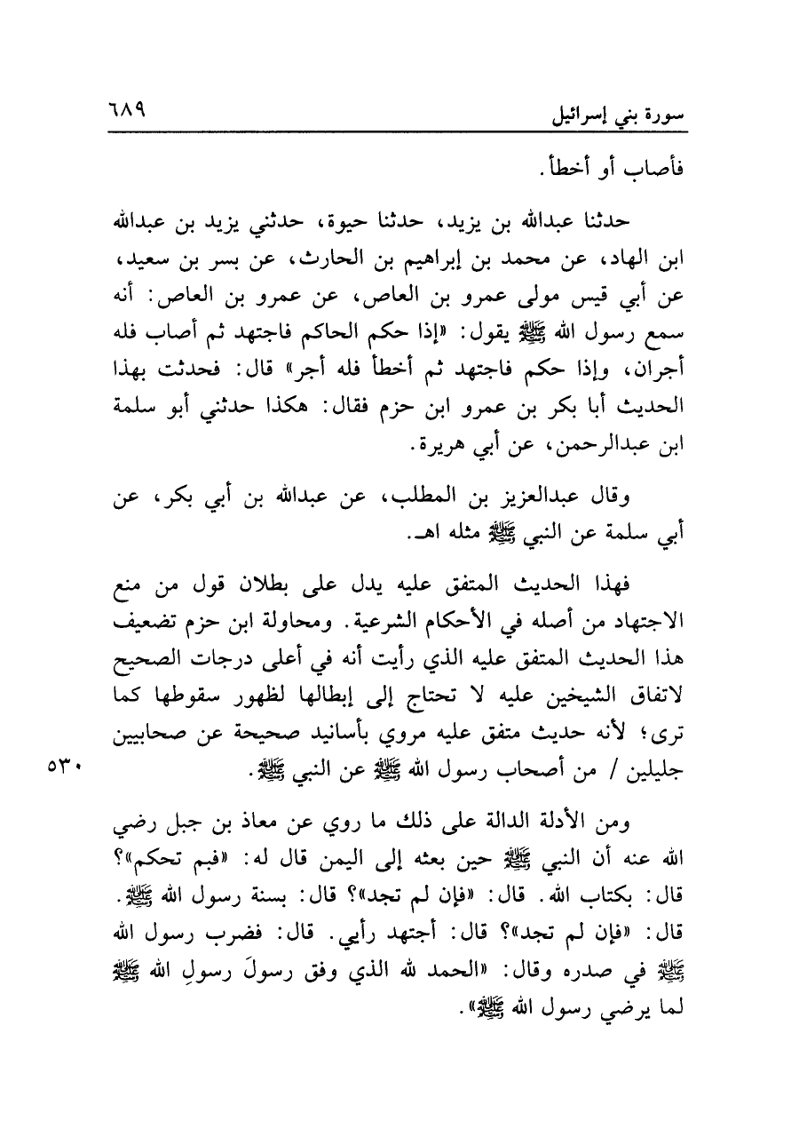 فهذا الحديث المتفق عليه يدل على بطلان قول من منع الاجتهاد من أصله في الأحكام الشرعية. ومحاولة ابن حزم تضعيف هذا الحديث المتفق عليه الذي رأيت أنه في أعلى درجات الصحيح لاتفاق الشيخين عليه لا تحتاج إلى إبطالها لظهور سقوطها كما ترى؛ لأنه حديث متفق عليه مروي بأسانيد صحيحة عن صحابيين جليلين من أصحاب رسول الله - صلى الله عليه وسلم - عن النبي - صلى الله عليه وسلم -.