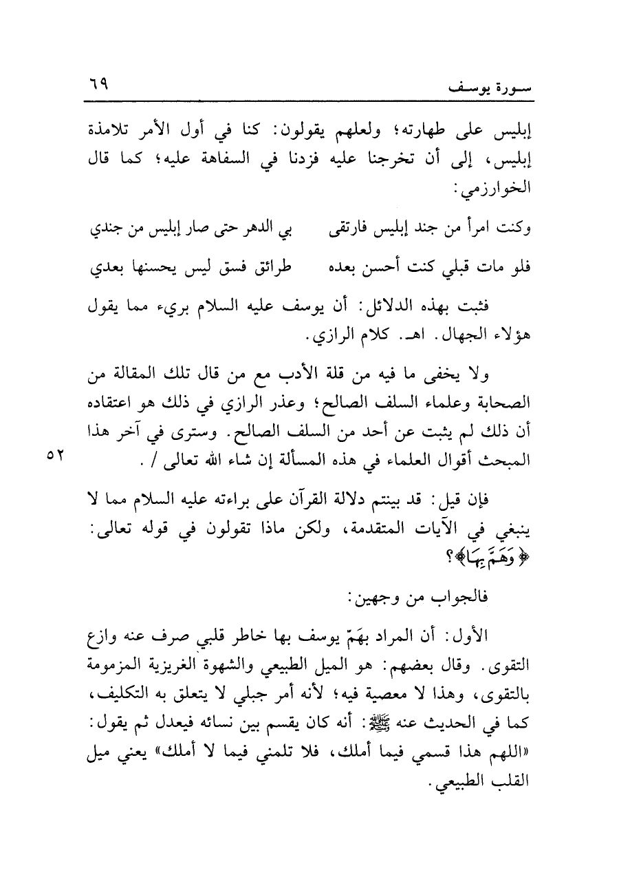 الأول: أن المراد بهمّ يوسف بها خاطر قلبي صرف عنه وازع التقوى. وقال بعضهم: هو الميل الطبيعي والشهوة الغريزية المزمومة بالتقوى، وهذا لا معصية فيه؛ لأنه أمر جبلي لا يتعلق به التكليف، كما في الحديث عنه - صلى الله عليه وسلم -: أنه كان يقسم بين نسائه فيعدل ثم يقول: "اللهم هذا قسمي فيما أملك، فلا تلمني فيما لا أملك" يعني ميل القلب الطبيعي.