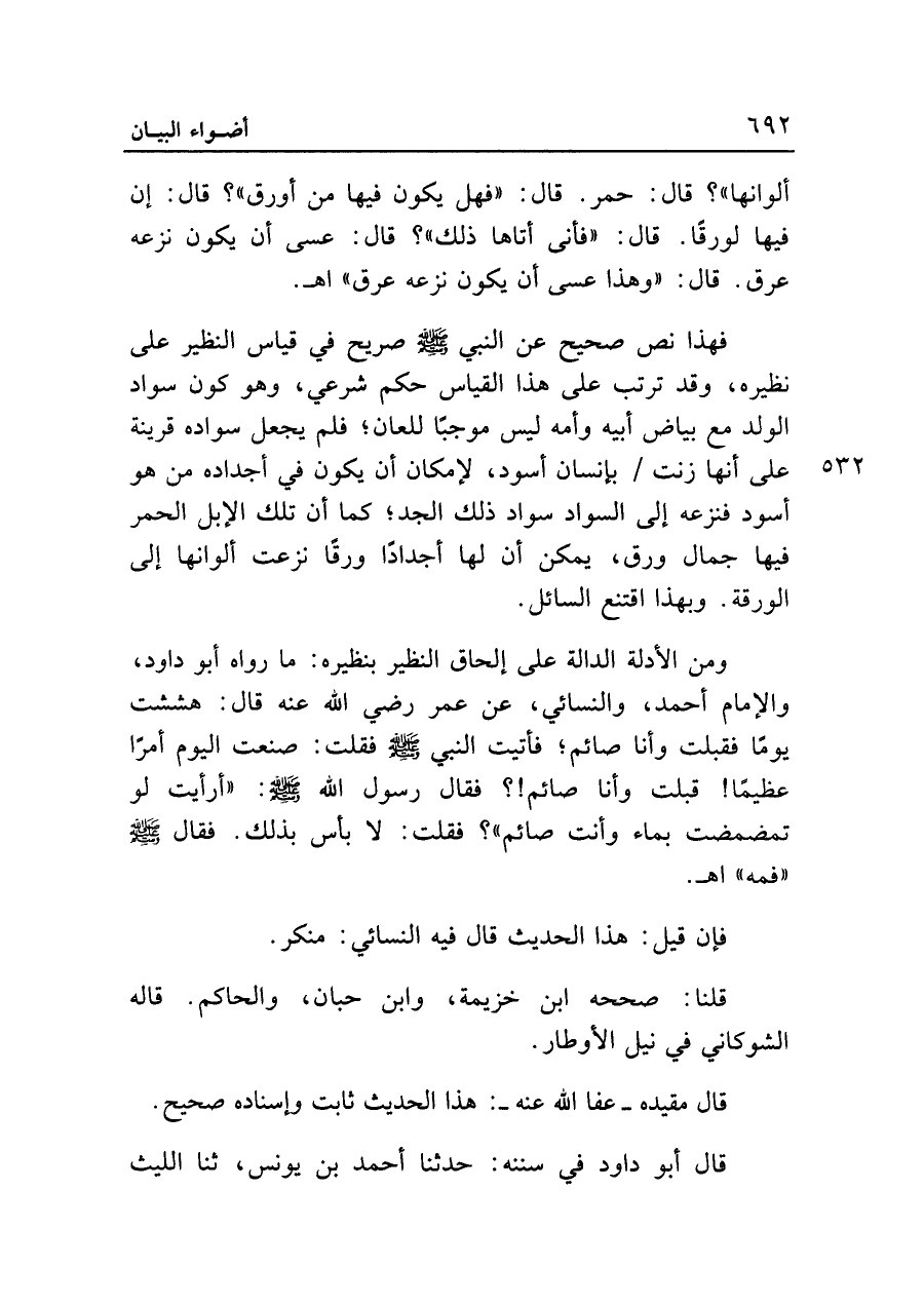 فهذا نص صحيح عن النبي - صلى الله عليه وسلم - صريح في قياس النظير على نظيره، وقد ترتب على هذا القياس حكم شرعي، وهو كون سواد الولد مع بياض أبيه وأمه ليس موجبًا للعان؛ فلم يجعل سواده قرينة على أنها زنت بإنسان أسود، لإمكان أن يكون في أجداده من هو أسود فنزعه إلى السواد سواد ذلك الجد؛ كما أن تلك الإبل الحمر فيها جمال ورق، يمكن أن لها أجدادًا ورقًا نزعت ألوانها إلى الورقة. وبهذا اقتنع السائل.