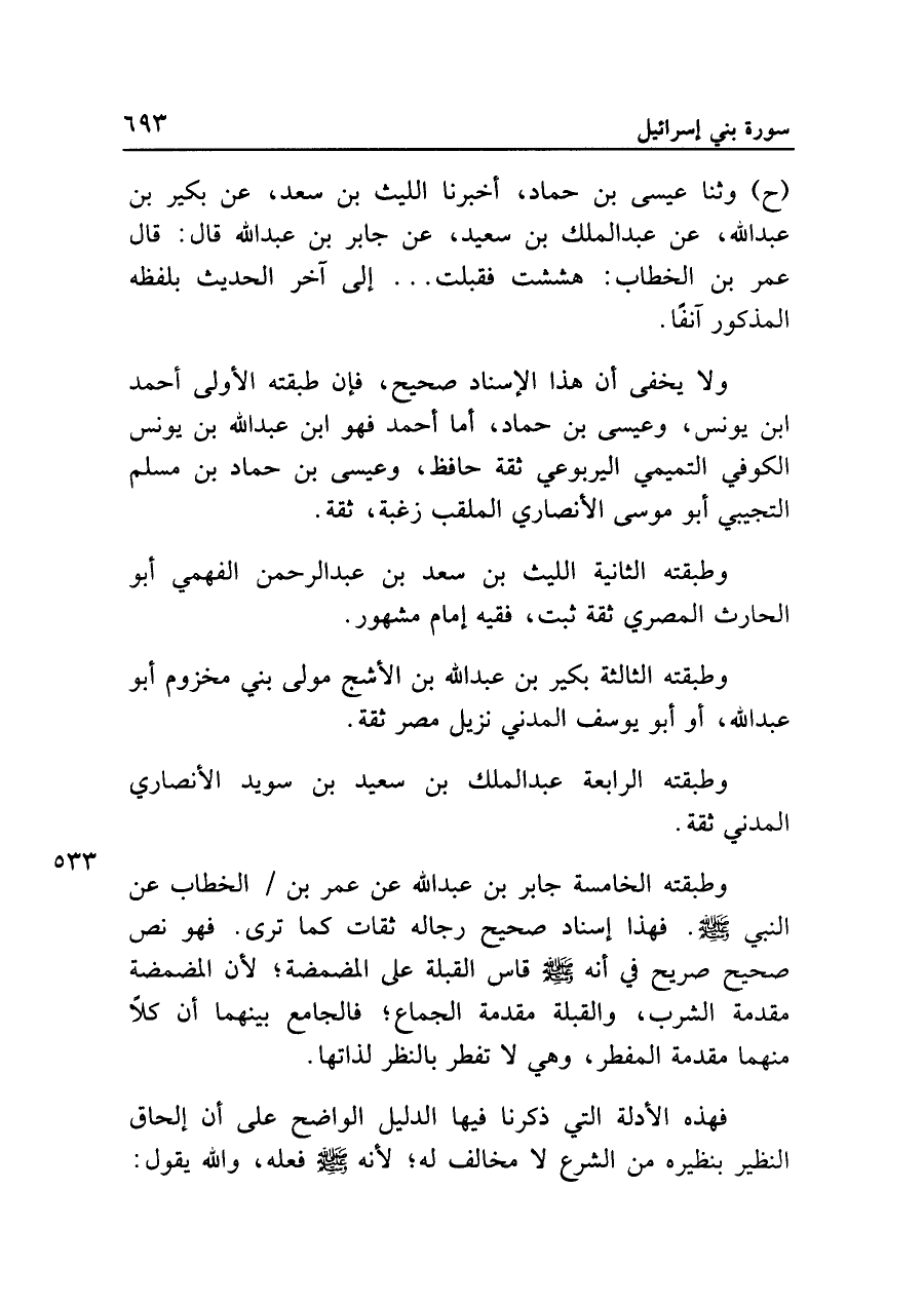 وطبقته الخامسة جابر بن عبد الله عن عمر بن الخطاب عن النبي - صلى الله عليه وسلم -. فهذا إسناد صحيح رجاله ثقات كما ترى. فهو نص صحيح صريح في أنه - صلى الله عليه وسلم - قاس القبلة على المضمضة؛ لأن المضمضة مقدمة الشرب، والقبلة مقدمة الجماع؛ فالجامع بينهما أن كلًا منهما مقدمة المفطر، وهي لا تفطر بالنظر لذاتها.