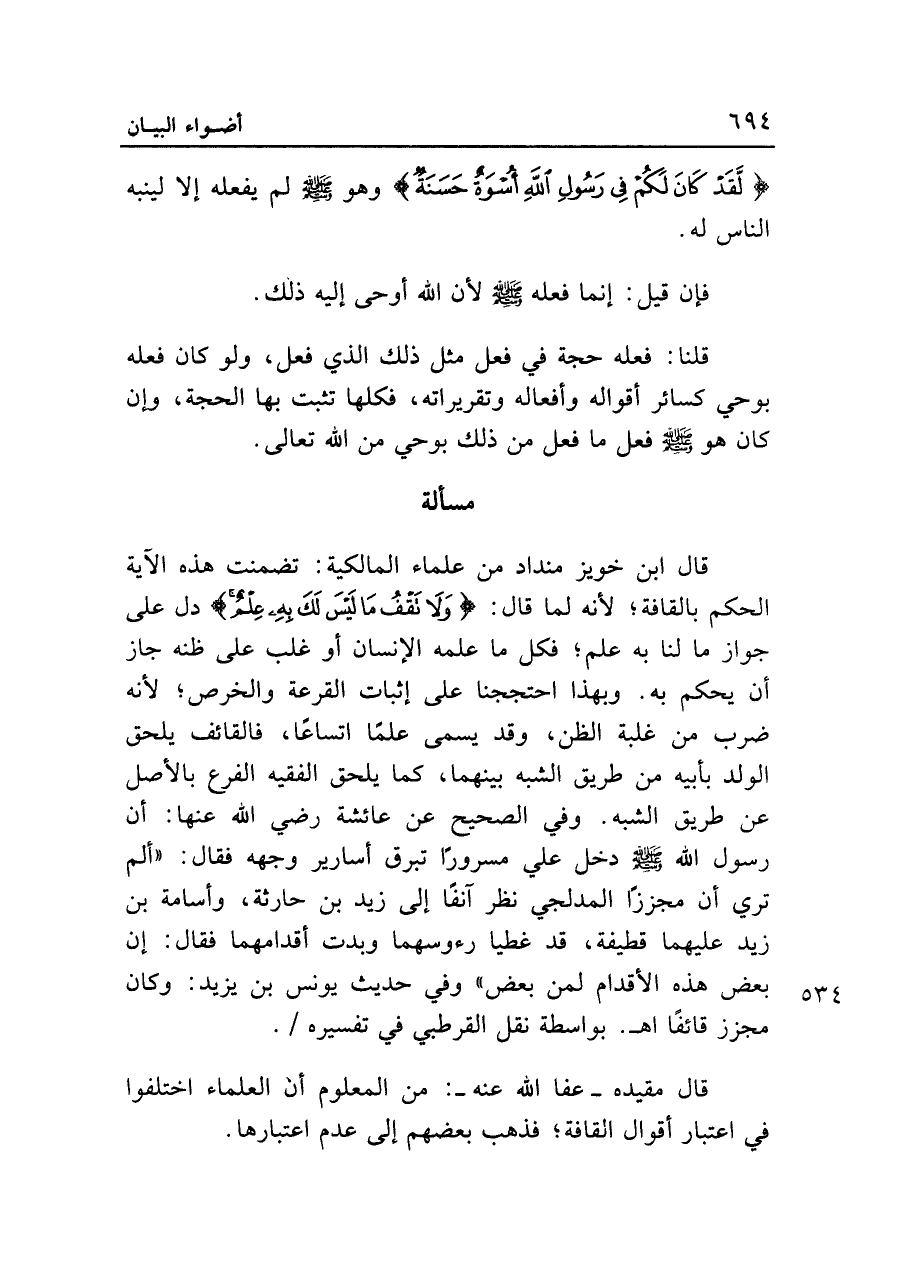 قال ابن خويز منداد من علماء المالكية: تضمنت هذه الآية الحكم بالقافة؛ لأنه لما قال: {وَلَا تَقْفُ مَا لَيْسَ لَكَ بِهِ عِلْمٌ} دل على جواز ما لنا به علم؛ فكل ما علمه الإنسان أو غلب على ظنه جاز أن يحكم به. وبهذا احتججنا على إثبات القرعة والخرص؛ لأنه ضرب من غلبة الظن، وقد يسمى علمًا اتساعًا، فالقائف يلحق الولد بأبيه من طريق الشبه بينهما، كما يلحق الفقيه الفرع بالأصل عن طريق الشبه. وفي الصحيح عن عائشة رضي الله عنها: أن رسول الله - صلى الله عليه وسلم - دخل علي مسرورًا تبرق أسارير وجهه فقال: "ألم تري أن مجززًا المدلجي نظر آنفًا إلى زيد بن حارثة، وأسامة بن زيد عليهما قطيفة، قد غطيا رءوسهما وبدت أقدامهما فقال: إن بعض هذه الأقدام لمن بعض" وفي حديث يونس بن يزيد: وكان مجزز قائفًا اهـ. بواسطة نقل القرطبي في تفسيره.