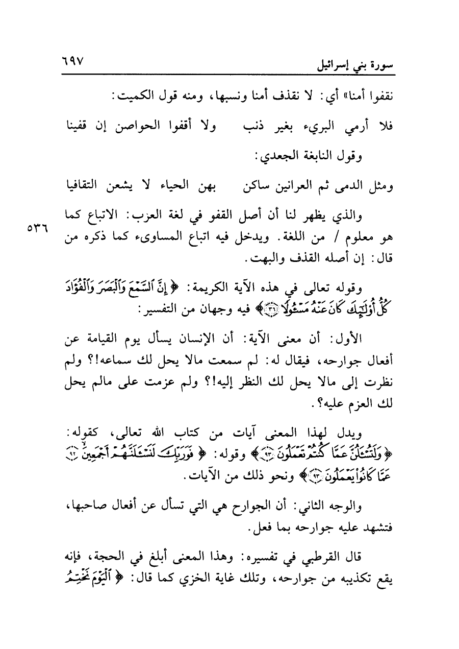 الأول: أن معنى الآية: أن الإنسان يسأل يوم القيامة عن أفعال جوارحه، فيقال له: لم سمعت ما لا يحل لك سماعه!؟ ولم نظرت إلى ما لا يحل لك النظر إليه!؟ ولم عزمت على ما لم يحل لك العزم عليه؟.