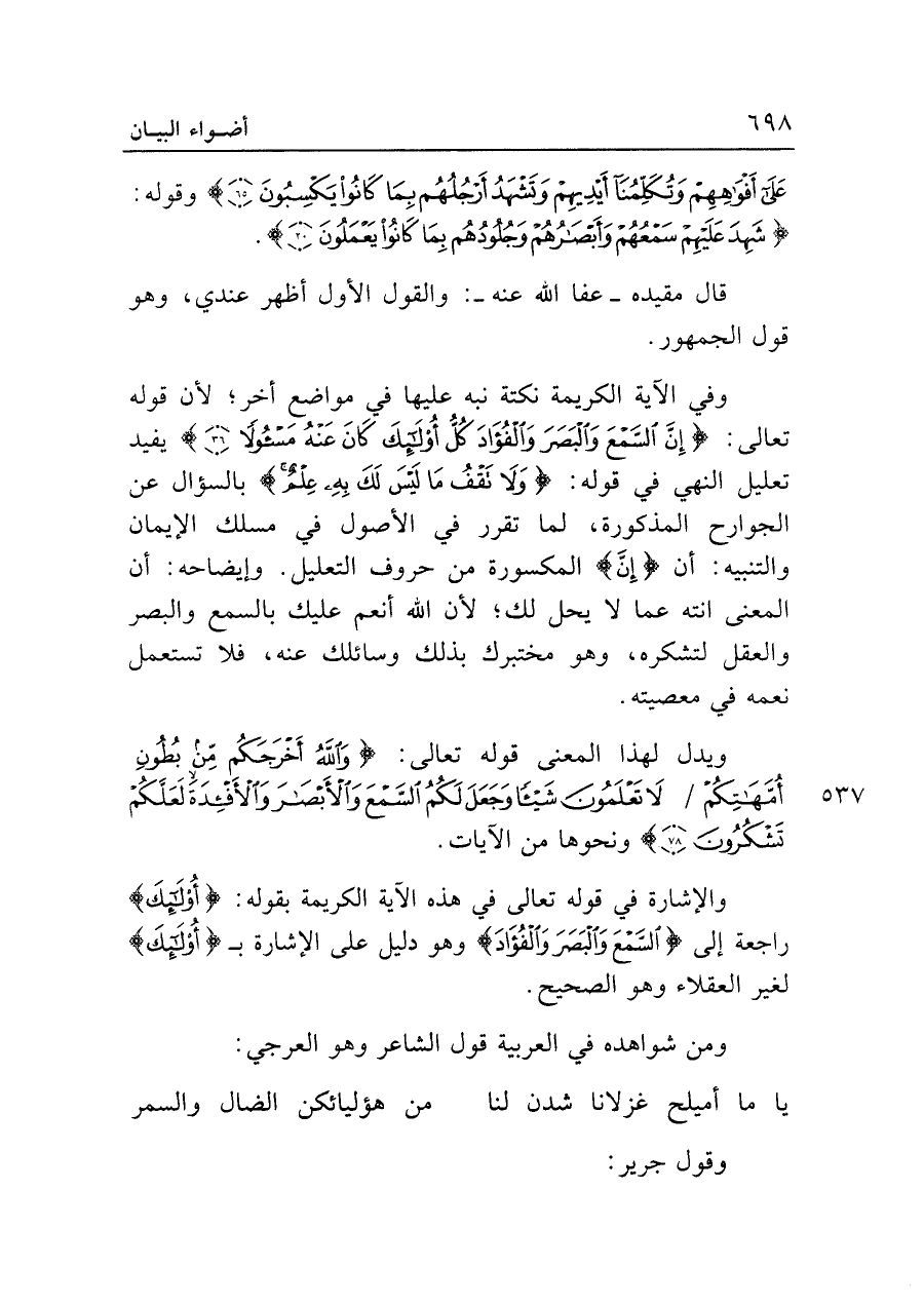وفي الآية الكريمة نكتة نبه عليها في مواضع أخر؛ لأن قوله تعالى: {إِنَّ السَّمْعَ وَالْبَصَرَ وَالْفُؤَادَ كُلُّ أُولَئِكَ كَانَ عَنْهُ مَسْئُولًا (٣٦)} يفيد تعليل النهي في قوله: {وَلَا تَقْفُ مَا لَيْسَ لَكَ بِهِ عِلْمٌ} بالسؤال عن الجوارح المذكورة، لما تقرر في الأصول في مسلك الإيمان والتنبيه: أن {إِنَّ} المكسورة من حروف التعليل. وإيضاحه: أن المعنى انته عما لا يحل لك؛ لأن الله أنعم عليك بالسمع والبصر والعقل لتشكره، وهو مختبرك بذلك وسائلك عنه، فلا تستعمل نعمه في معصيته.