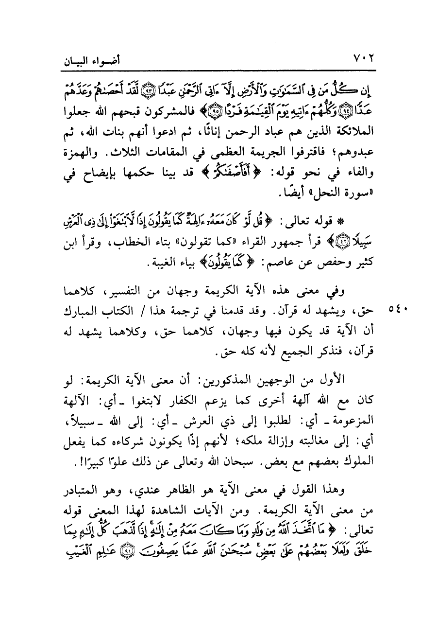 وهذا القول في معنى الآية هو الظاهر عندي، وهو المتبادر من معنى الآية الكريمة. ومن الآيات الشاهدة لهذا المعنى قوله تعالى: {مَا اتَّخَذَ اللَّهُ مِنْ وَلَدٍ وَمَا كَانَ مَعَهُ مِنْ إِلَهٍ إِذًا لَذَهَبَ كُلُّ إِلَهٍ بِمَا خَلَقَ وَلَعَلَا بَعْضُهُمْ عَلَى بَعْضٍ سُبْحَانَ اللَّهِ عَمَّا يَصِفُونَ (٩١) عَالِمِ الْغَيْبِ