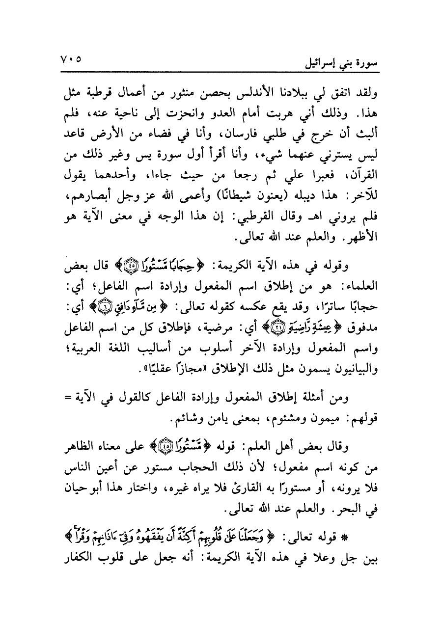 وقال بعض أهل العلم: قوله {مَسْتُورًا (٤٥)} على معناه الظاهر من كونه اسم مفعول؛ لأن ذلك الحجاب مستور عن أعين الناس فلا يرونه، أو مستورًا به القارئ فلا يراه غيره، واختار هذا أبو حيان في البحر. والعلم عند الله تعالى.