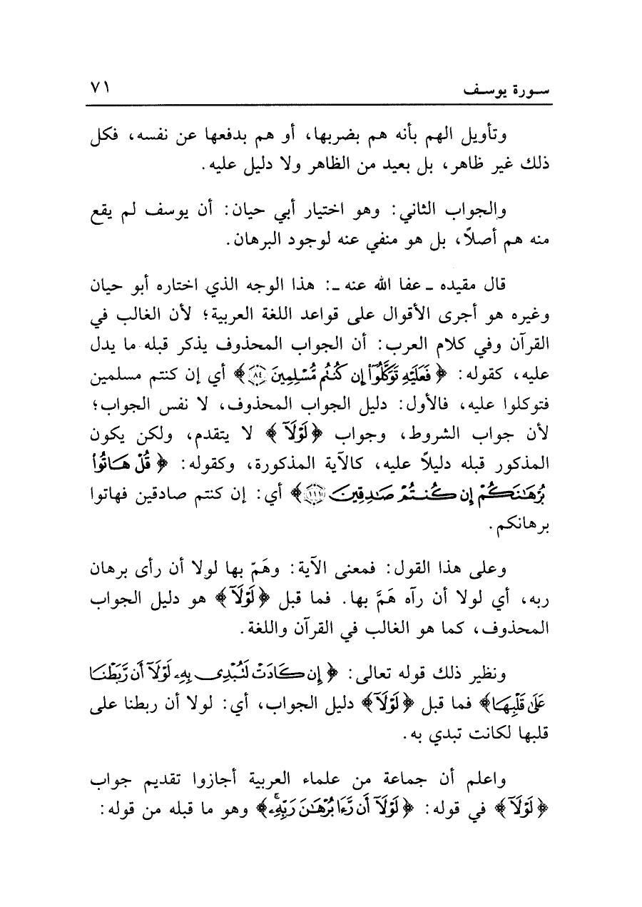 واعلم أن جماعة من علماء العربية أجازوا تقديم جواب {لَوْلَا} في قوله: {لَوْلَا أَنْ رَأَى بُرْهَانَ رَبِّهِ} وهو ما قبله من قوله: