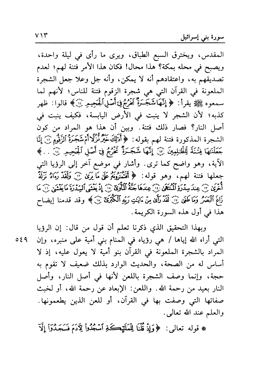 المقدس، ويخترق السبع الطباق، ويرى ما رأى في ليلة واحدة، ويصبح في محله بمكة؟ هذا محال! فكان هذا الأمر فتنة لهم؛ لعدم تصديقهم به، واعتقادهم أنه لا يمكن، وأنه جل وعلا جعل الشجرة الملعونة في القرآن التي هي شجرة الزقوم فتنة للناس؛ لأنهم لما سمعوه - صلى الله عليه وسلم - يقرأ: {إِنَّهَا شَجَرَةٌ تَخْرُجُ فِي أَصْلِ الْجَحِيمِ (٦٤)} قالوا: ظهر كذبه؛ لأن الشجر لا ينبت في الأرض اليابسة، فكيف ينبت في أصل النار؟ فصار ذلك فتنة. وبين أن هذا هو المراد من كون الشجرة المذكورة فتنة لهم بقوله: {أَذَلِكَ خَيْرٌ نُزُلًا أَمْ شَجَرَةُ الزَّقُّومِ (٦٢) إِنَّا جَعَلْنَاهَا فِتْنَةً لِلظَّالِمِينَ (٦٣) إِنَّهَا شَجَرَةٌ تَخْرُجُ فِي أَصْلِ الْجَحِيمِ (٦٤). .} الآية، وهو واضح كما ترى. وأشار في موضع آخر إلى الرؤيا التي جعلها فتنة لهم، وهو قوله: {أَفَتُمَارُونَهُ عَلَى مَا يَرَى (١٢) وَلَقَدْ رَآهُ نَزْلَةً أُخْرَى (١٣) عِنْدَ سِدْرَةِ الْمُنْتَهَى (١٤) عِنْدَهَا جَنَّةُ الْمَأْوَى (١٥) إِذْ يَغْشَى السِّدْرَةَ مَا يَغْشَى (١٦) مَا زَاغَ الْبَصَرُ وَمَا طَغَى (١٧) لَقَدْ رَأَى مِنْ آيَاتِ رَبِّهِ الْكُبْرَى (١٨)} وقد قدمنا إيضاح هذا في أول هذه السورة الكريمة.