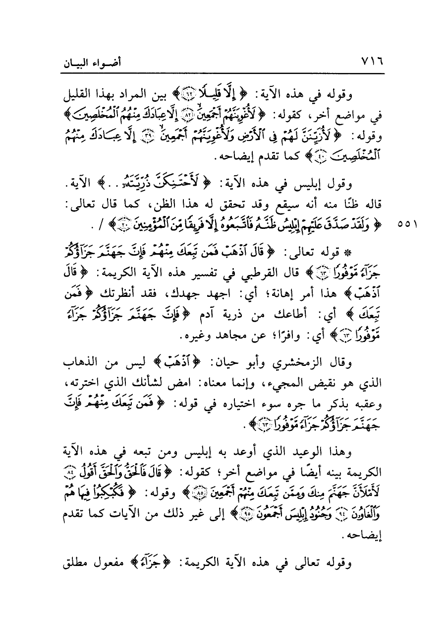 • قوله تعالى: {قَالَ اذْهَبْ فَمَنْ تَبِعَكَ مِنْهُمْ فَإِنَّ جَهَنَّمَ جَزَاؤُكُمْ جَزَاءً مَوْفُورًا (٦٣)} قال القرطبي في تفسير هذه الآية الكريمة: {قَالَ اذْهَبْ} هذا أمر إهانة؛ أي: اجهد جهدك، فقد أنظرتك {فَمَنْ تَبِعَكَ} أي: أطاعك من ذرية آدم {فَإِنَّ جَهَنَّمَ جَزَاؤُكُمْ جَزَاءً مَوْفُورًا (٦٣)} أي: وافرًا؛ عن مجاهد وغيره.
