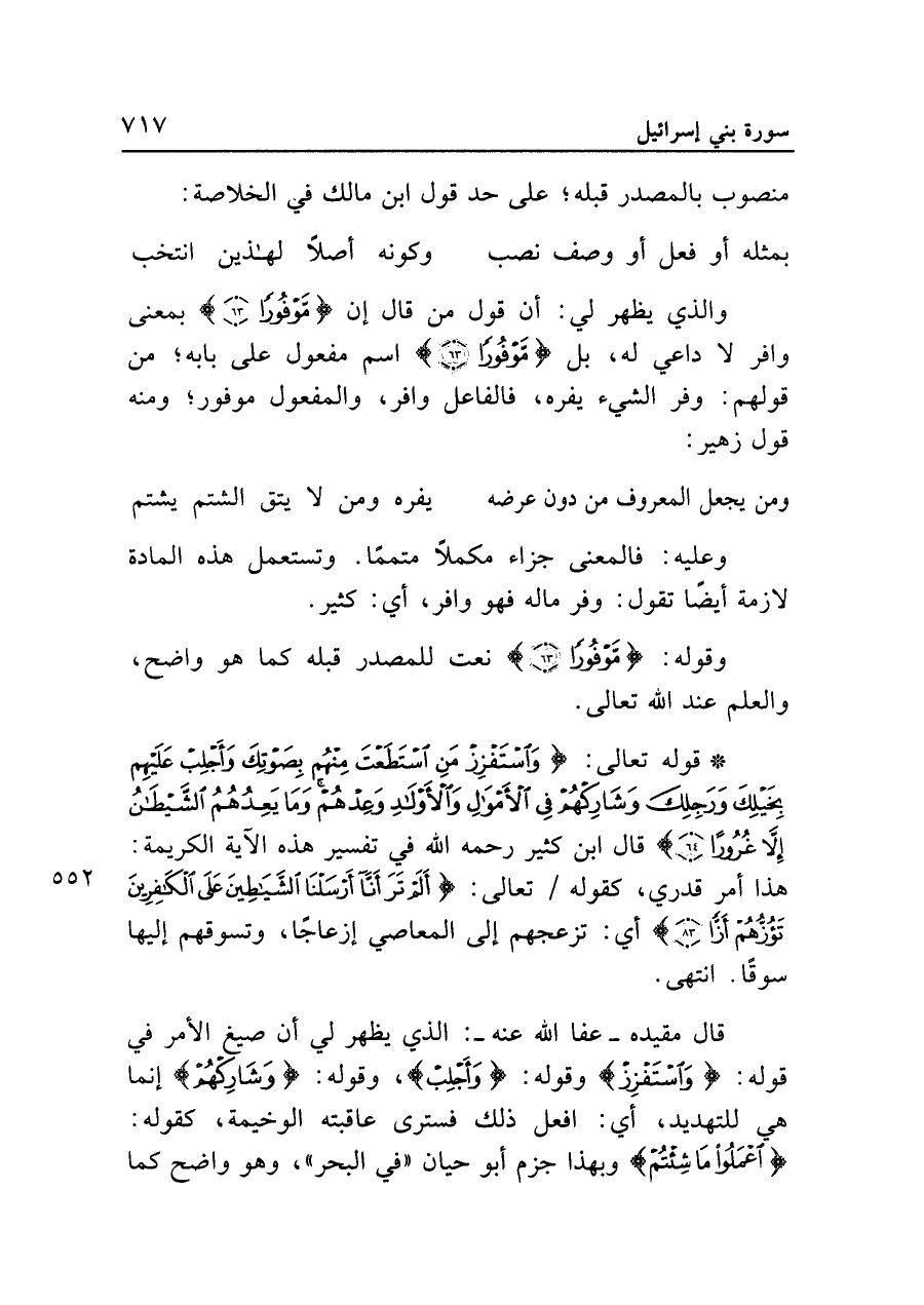 والذي يظهر لي: أن قول من قال إن {مَوْفُورًا (٦٣)} بمعنى وافر لا داعي له، بل {مَوْفُورًا (٦٣)} اسم مفعول على بابه؛ من قولهم: وفر الشيء يفره، فالفاعل وافر، والمفعول موفور؛ ومنه قول زهير: