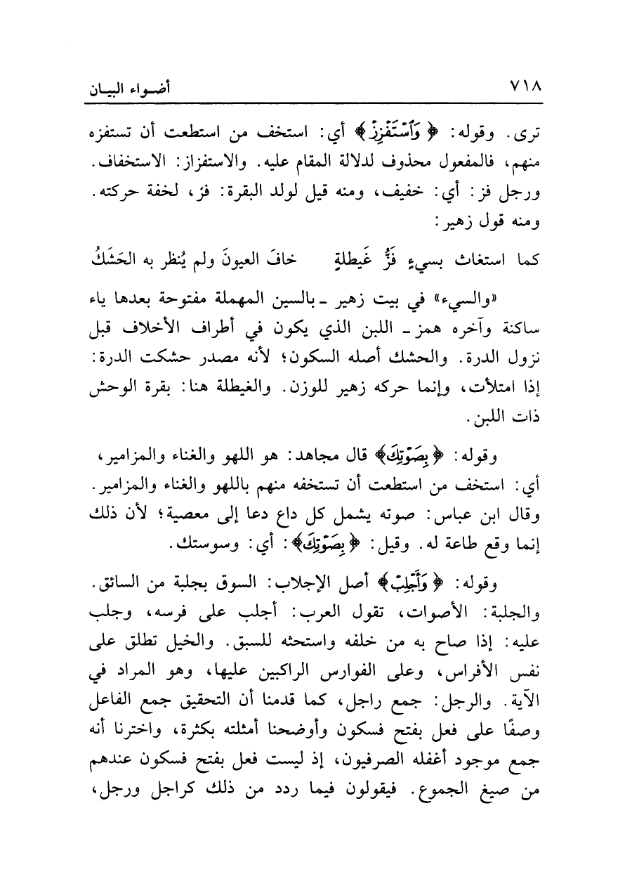 وقوله: {وَأَجْلِبْ} أصل الإجلاب: السوق بجلبة من السائق. والجلبة: الأصوات، تقول العرب: أجلب على فرسه، وجلب عليه: إذا صاح به من خلفه واستحثه للسبق. والخيل تطلق على نفس الأفراس، وعلى الفوارس الراكبين عليها، وهو المراد في الآية. والرجل: جمع راجل، كما قدمنا أن التحقيق جمع الفاعل وصفًا على فعل بفتح فسكون وأوضحنا أمثلته بكثرة، واخترنا أنه جمع موجود أغفله الصرفيون، إذ ليست فعل بفتح فسكون عندهم من صيغ الجموع. فيقولون فيما ردد من ذلك كراجل ورجل،