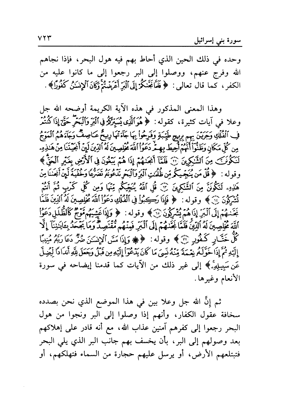 ثم إِنَّ الله جل وعلا بين في هذا الموضع الذي نحن بصدده سخافة عقول الكفار، وأنهم إذا وصلوا إلى البر ونجوا من هول البحر رجعوا إلى كفرهم آمنين عذاب الله، مع أنه قادر على إهلاكهم بعد وصولهم إلى البر، بأن يخسف بهم جانب البر الذي يلي البحر فتبتلعهم الأرض، أو يرسل عليهم حجارة من السماء فتهلكهم، أو