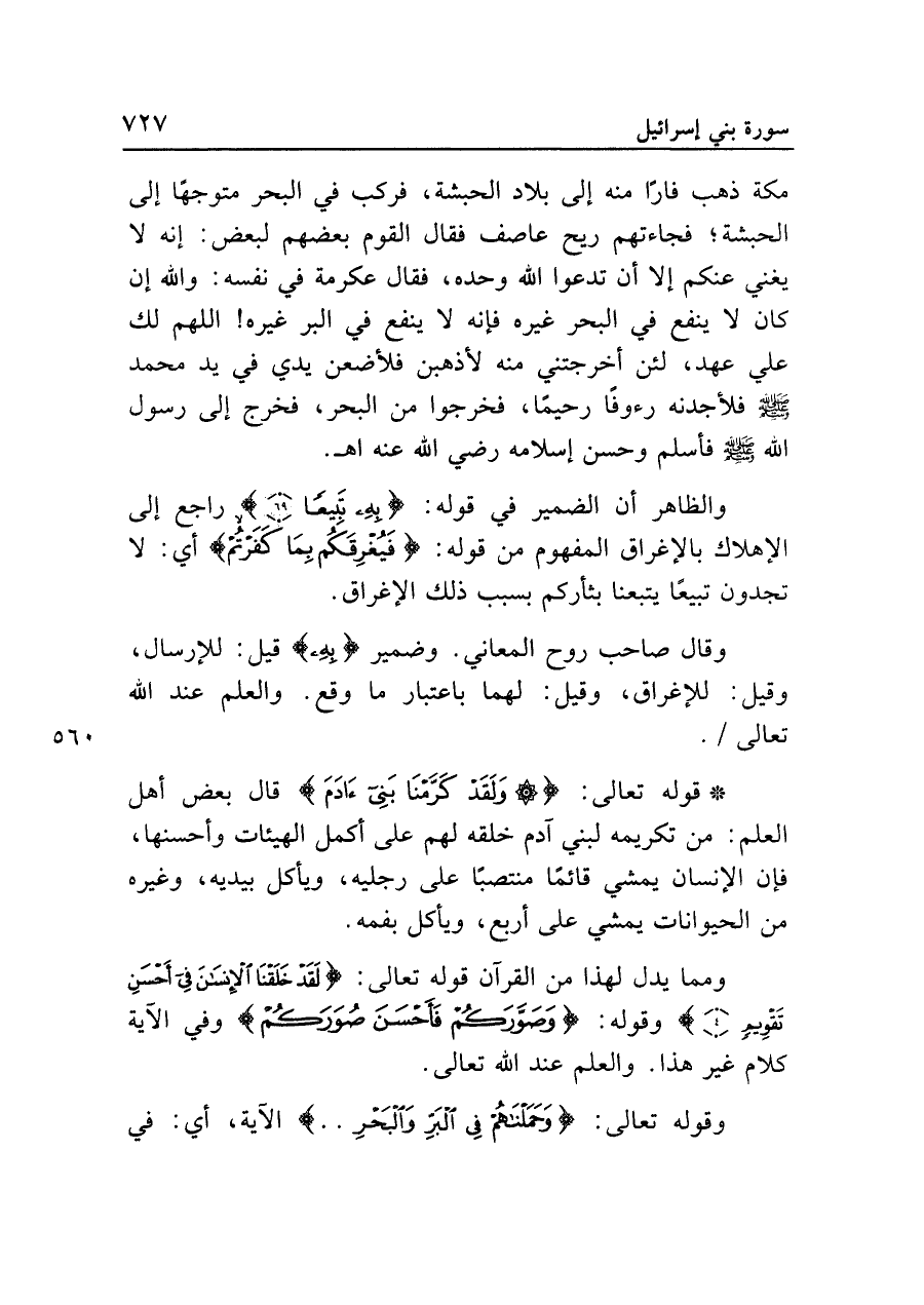 • قوله تعالى: {وَلَقَدْ كَرَّمْنَا بَنِي آدَمَ} قال بعض أهل العلم: من تكريمه لبني آدم خلقه لهم على أكمل الهيئات وأحسنها، فإن الإنسان يمشي قائمًا منتصبًا على رجليه، ويأكل بيديه، وغيره من الحيوانات يمشي على أربع، ويأكل بفمه.