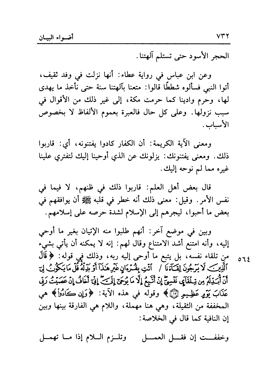 وعن ابن عباس في رواية عطاء: أنها نزلت في وفد ثقيف، أتوا النبي فسألوه شططًا قالوا: متعنا بآلهتنا سنة حتى نأخذ ما يهدى لها، وحرم وادينا كما حرمت مكة، إلى غير ذلك من الأقوال في سبب نزولها. وعلى كل حال فالعبرة بعموم الألفاظ لا بخصوص الأسباب.
