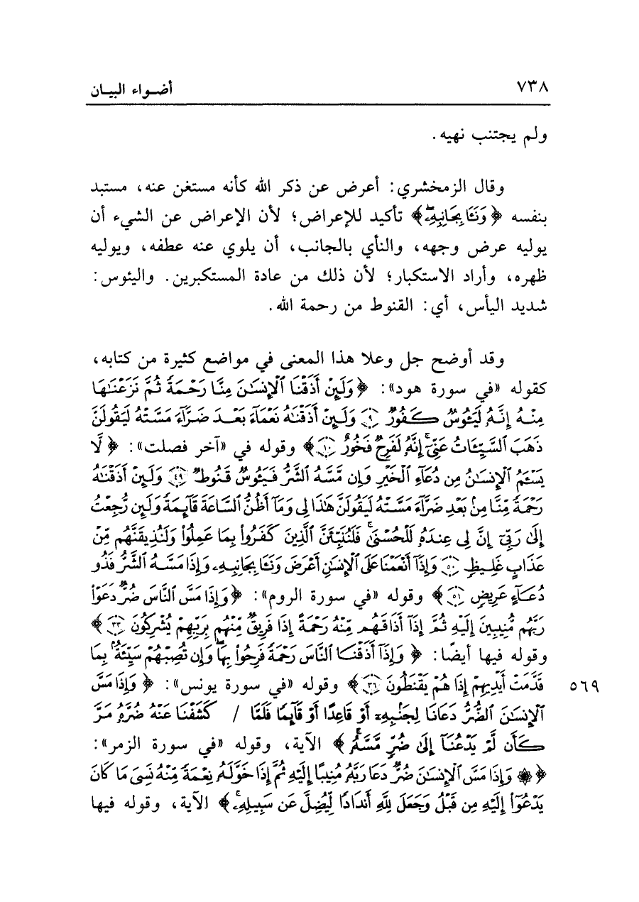 وقد أوضح جل وعلا هذا المعنى في مواضع كثيرة من كتابه، كقوله "في سورة هود": {وَلَئِنْ أَذَقْنَا الْإِنْسَانَ مِنَّا رَحْمَةً ثُمَّ نَزَعْنَاهَا مِنْهُ إِنَّهُ لَيَئُوسٌ كَفُورٌ (٩) وَلَئِنْ أَذَقْنَاهُ نَعْمَاءَ بَعْدَ ضَرَّاءَ مَسَّتْهُ لَيَقُولَنَّ ذَهَبَ السَّيِّئَاتُ عَنِّي إِنَّهُ لَفَرِحٌ فَخُورٌ (١٠)} وقوله في "آخر فصلت": {لَا يَسْأَمُ الْإِنْسَانُ مِنْ دُعَاءِ الْخَيْرِ وَإِنْ مَسَّهُ الشَّرُّ فَيَئُوسٌ قَنُوطٌ (٤٩) وَلَئِنْ أَذَقْنَاهُ رَحْمَةً مِنَّا مِنْ بَعْدِ ضَرَّاءَ مَسَّتْهُ لَيَقُولَنَّ هَذَا لِي وَمَا أَظُنُّ السَّاعَةَ قَائِمَةً وَلَئِنْ رُجِعْتُ إِلَى رَبِّي إِنَّ لِي عِنْدَهُ لَلْحُسْنَى فَلَنُنَبِّئَنَّ الَّذِينَ كَفَرُوا بِمَا عَمِلُوا وَلَنُذِيقَنَّهُمْ مِنْ عَذَابٍ غَلِيظٍ (٥٠) وَإِذَا أَنْعَمْنَا عَلَى الْإِنْسَانِ أَعْرَضَ وَنَأَى بِجَانِبِهِ وَإِذَا مَسَّهُ الشَّرُّ فَذُو دُعَاءٍ عَرِيضٍ (٥١)} وقوله "في سورة الروم": {وَإِذَا مَسَّ النَّاسَ ضُرٌّ دَعَوْا رَبَّهُمْ مُنِيبِينَ إِلَيْهِ ثُمَّ إِذَا أَذَاقَهُمْ مِنْهُ رَحْمَةً إِذَا فَرِيقٌ مِنْهُمْ بِرَبِّهِمْ يُشْرِكُونَ (٣٣)} وقوله فيها أيضًا: {وَإِذَا أَذَقْنَا النَّاسَ رَحْمَةً فَرِحُوا بِهَا وَإِنْ تُصِبْهُمْ سَيِّئَةٌ بِمَا قَدَّمَتْ أَيْدِيهِمْ إِذَا هُمْ يَقْنَطُونَ (٣٦)} وقوله "في سورة يونس": {وَإِذَا مَسَّ الْإِنْسَانَ الضُّرُّ دَعَانَا لِجَنْبِهِ أَوْ قَاعِدًا أَوْ قَائِمًا فَلَمَّا كَشَفْنَا عَنْهُ ضُرَّهُ مَرَّ كَأَنْ لَمْ يَدْعُنَا إِلَى ضُرٍّ مَسَّهُ} الآية، وقوله "في سورة الزمر": {وَإِذَا مَسَّ الْإِنْسَانَ ضُرٌّ دَعَا رَبَّهُ مُنِيبًا إِلَيْهِ ثُمَّ إِذَا خَوَّلَهُ نِعْمَةً مِنْهُ نَسِيَ مَا كَانَ يَدْعُو إِلَيْهِ مِنْ قَبْلُ وَجَعَلَ لِلَّهِ أَنْدَادًا لِيُضِلَّ عَنْ سَبِيلِهِ} الآية، وقوله فيها